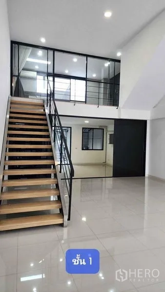 ทาวน์เฮ้าส์ 4 ห้องนอน 4 ห้องน้ำ ในย่านนวมินทร์ บึงกุ่ม พื้นที่ใช้สอย 363 ตร.ม. บนที่ดิน 26 ตร.วา (ประมาณ 104 ตร.ม. หรือ 0.065 ไร่) ออกแบบให้ใช้ชีวิตและทำงานได้ในหลังเดียว โถงรับแขกเพดานสูงแบบดับเบิลวอลุ่มเชื่อมชั้นลอย พื้นที่แต่ละชั้นเป็นแบบโอเพ่นเพลน มีกระจกกั้นโปร่ง พื้นลายไม้ ไฟ LED และหน้าต่างบานใหญ่พร้อมเครื่องปรับอากาศ ชั้นล่างเชื่อมต่อสู่ลานซักล้างพร้อมถังเก็บน้ำและห้องน้ำ เหมาะเป็นโฮมออฟฟิศ สตูดิโอ หรือที่อยู่อาศัยกว้างขวาง