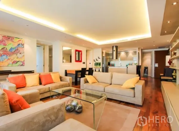คอนโดมิเนียมหรู 4 ห้องนอน 4 ห้องน้ำ พื้นที่ใช้สอยประมาณ 294 ตร.ม. ใจกลางพญาไท เพียงไม่ไกลจาก BTS อารีย์ พื้นไม้ทั้งห้องและฝ้าซ่อนไฟให้บรรยากาศอบอุ่น โถงนั่งเล่น–รับประทานอาหารขนาดใหญ่รับแสงธรรมชาติจากกระจกสูงจรดเพดาน ครัวเปิดพร้อมไอแลนด์ ท็อปหิน และพื้นที่เก็บของครบ เหมาะสำหรับทำอาหารและสังสรรค์ ห้องนอนกว้างขวางมีตู้เสื้อผ้า และห้องน้ำส่วนตัวพร้อมฝักบัวกระจก บางห้องมีอ่างอาบน้ำเพื่อการผ่อนคลาย