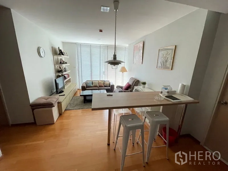 คอนโดขนาด 76 ตร.ม. 2 ห้องนอน 2 ห้องน้ำ ใจกลางย่านสุขุมวิท–เอกมัย โดดเด่นด้วยผังห้องแบบเปิดโล่ง สว่างด้วยหน้าต่างบานเกล็ดเต็มผนัง พื้นไม้ให้บรรยากาศอบอุ่น เคาน์เตอร์บาร์เชื่อมต่อครัวบิลท์อินพร้อมเตา ไมโครเวฟ และที่เก็บของครบ ห้องนอนทั้งสองมีตู้เสื้อผ้าบิลท์อิน ส่วนห้องน้ำทันสมัย หนึ่งห้องเป็นตู้ชาวเวอร์กระจก อีกห้องมีอ่างอาบน้ำพร้อมฉากกั้นและกระจกบานใหญ่