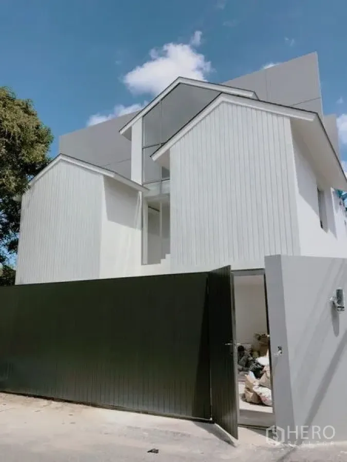 พบกับบ้านเดี่ยวสไตล์โมเดิร์นในย่านพระโขนง กรุงเทพฯ พื้นที่ใช้สอย 350 ตร.ม. 3 ห้องนอน 4 ห้องน้ำ โซนรับแขกเพดานสูงโปร่ง พื้นไม้ลายก้างปลา เชื่อมต่อสวนส่วนตัวผ่านประตูกระจกบานใหญ่ ครัวสวยพร้อมไอส์แลนด์ แผงกันเปื้อนลายหินอ่อน และเครื่องใช้บิวท์อิน ถัดไปเป็นพื้นที่ทานอาหาร ห้องน้ำสไตล์สปาพร้อมห้องอาบน้ำกระจก Rain Shower อ่างล้างหน้าคู่ และอ่างอาบน้ำแบบลอยตัว ห้องนอนหลักมีระเบียงและห้องแต่งตัวแยก