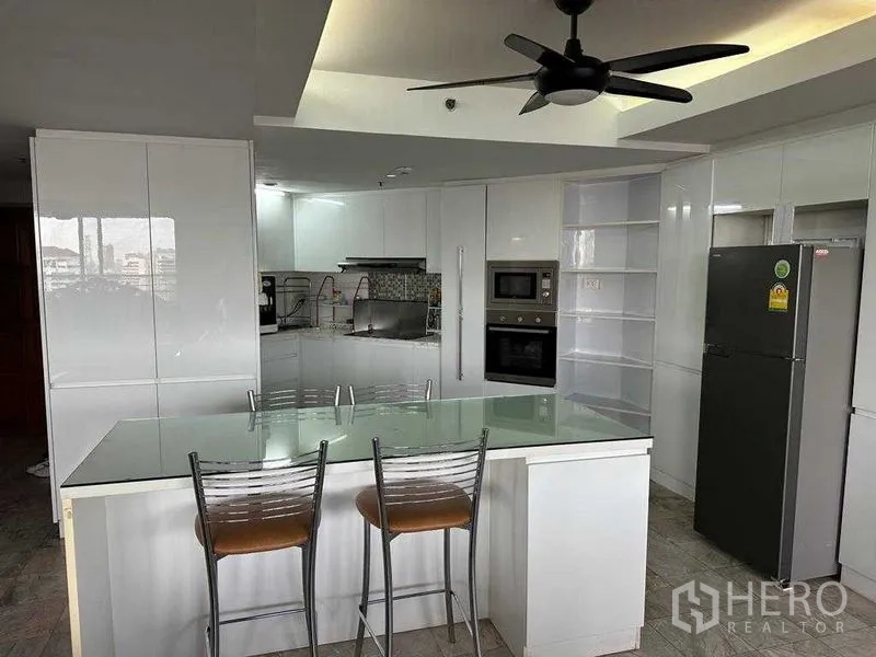คอนโดมิเนียม 3 ห้องนอน 3 ห้องน้ำ พื้นที่ใช้สอย 220 ตร.ม. ในย่านจตุจักร กรุงเทพฯ มอบพื้นที่นั่งเล่นแบบโอเพ่นขนาดใหญ่เชื่อมต่อระเบียงส่วนตัว ชมวิวสกายไลน์เมืองอย่างกว้างไกล ครัวโทนขาวสไตล์โมเดิร์นมีไอแลนด์ท็อปกระจก เตาอบและไมโครเวฟบิวท์อิน ตู้เก็บของจำนวนมาก เหมาะสำหรับทำอาหารและสังสรรค์ ห้องนอนโปร่งสบายพร้อมตู้เสื้อผ้าและพัดลมเพดาน ห้องน้ำมีตู้ชาวเวอร์กระจกและเครื่องทำน้ำอุ่น