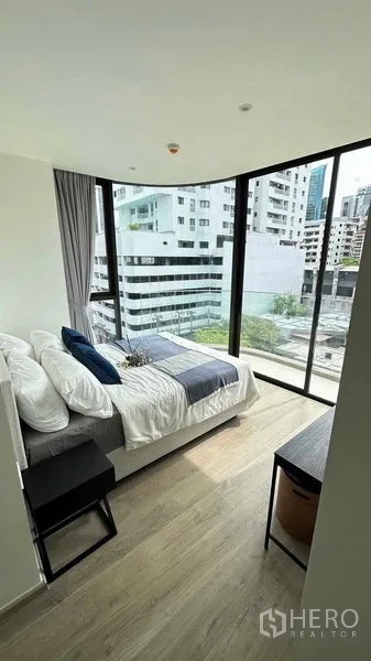 คอนโดมิเนียม 2 ห้องนอน 2 ห้องน้ำ ขนาดใช้สอย 62 ตร.ม. ในเขตวัฒนา ออกแบบสวยสไตล์โมเดิร์น ห้องมุมกระจกเต็มบานรับแสงธรรมชาติและวิวสกายไลน์ ห้องนอนปูพื้นไม้พร้อมตู้เสื้อผ้าบานเลื่อนกระจกฝ้าและมุมทำงาน ห้องน้ำหินอ่อนแยกส่วนอาบน้ำกระจกและอ่างอาบน้ำแบบลอยตัวชมวิว ผ่อนคลายได้ทุกวันกับสระว่ายน้ำบรรยากาศรีสอร์ทและสวนสีเขียว
