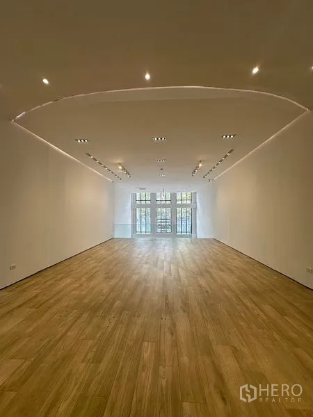 โฮมออฟฟิศสไตล์โมเดิร์นพื้นที่ใช้สอย 300 ตร.ม. ในย่านบางจาก พระโขนง โดดเด่นด้วยโถงต้อนรับเพดานสูงโปร่ง หน้าต่างกระจกเต็มบานรับแสงธรรมชาติ พื้นที่ทำงานแปลนเปิดปูพื้นลายไม้พร้อมไฟราง เหมาะจัดเป็นสำนักงาน สตูดิโอ หรือโชว์รูม มีชั้นลอยและห้องย่อยหลายจุดสำหรับห้องประชุม เก็บของ หรือห้องลองสินค้า ครบครันด้วยห้องน้ำ 3 ห้องใช้งานสะดวก