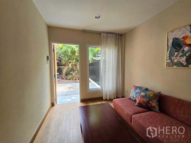 ทาวน์เฮ้าส์ 2 ห้องนอน 3 ห้องน้ำ พื้นที่ใช้สอย 130 ตร.ม. ในย่านบางนา เดินทางสะดวกเพียงไม่ไกลจาก BTS อุดมสุข พื้นที่นั่งเล่นและทานอาหารแบบโอเพ่นสเปซโปร่งโล่ง ปูพื้นลายไม้และไฟดาวน์ไลท์ มีมุมนั่งเล่นด้านหลังเชื่อมสู่ลานสวนเล็ก ๆ สำหรับพักผ่อน ครัวยูโรปทรงตัว U ท็อปไม้ ตู้เก็บของเยอะและหน้าต่างรับแสง ชั้นบนมีห้องนอนหลักพร้อมระเบียงและตู้เก็บของครบ อีกห้องรองรับเตียงเดี่ยวคู่ได้สบาย และมีที่จอดรถหน้าบ้านแบบมีหลังคาและประตูรั้ว