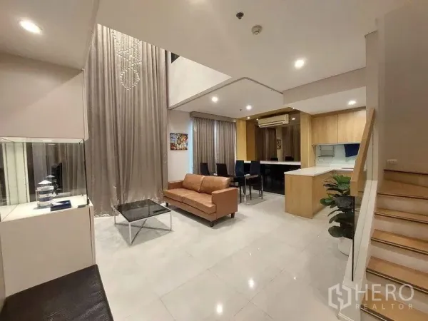 คอนโดมิเนียมดูเพล็กซ์ขนาดใหญ่ 303 ตร.ม. 4 ห้องนอน 4 ห้องน้ำ ในย่านราชเทวี มอบพื้นที่อยู่สบายพร้อมวิวสกายไลน์สุดอลัง การออกแบบโปร่งเพดานสูงแบบดับเบิลวอลุ่มเชื่อมต่อสู่ระเบียงกว้าง พื้นไม้ให้ความอบอุ่น บันไดราวกระจกทันสมัย ครัวหลักสไตล์เปิดมีไอแลนด์และตู้บิลท์อิน พร้อมครัวปิดสำหรับทำอาหารหนัก ห้องนอนรับแสงธรรมชาติเต็มที่ และห้องน้ำมีอ่างอาบน้ำกับตู้กระจกอาบน้ำแยกส่วน