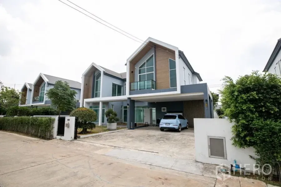 บ้านเดี่ยวสไตล์โมเดิร์นเพื่อขายในลำลูกกา ปทุมธานี พื้นที่ใช้สอย 267 ตร.ม. บนที่ดิน 101 ตร.วา (ประมาณ 404 ตร.ม. หรือราว 0.25 ไร่) จัดผัง 4 ห้องนอน 5 ห้องน้ำ โดดเด่นด้วยห้องนั่งเล่นดับเบิลวอยซ์ ผนังกระจกสูงเต็มผนัง เพดานจั่วโปร่ง และพื้นไม้โทนอุ่น พื้นที่ครอบครัวสว่างเชื่อมต่อเฉลียงคลุมหลังคาและสนามหญ้า เหมาะสำหรับเด็กหรือสัตว์เลี้ยง ห้องนอนกว้าง โถงชั้นบนและห้องอเนกประสงค์ปรับเป็นโฮมออฟฟิศได้ ที่จอดรถใต้อาคารรองรับ 2–3 คัน