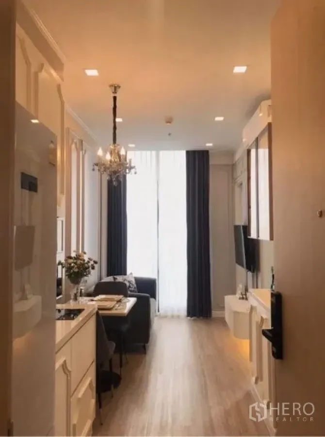 ใช้ชีวิตอย่างมีสไตล์ในคอนโด 1 ห้องนอน 1 ห้องน้ำ ย่านวัฒนา ใกล้ BTS พร้อมพงษ์ พื้นที่ใช้สอย 30 ตร.ม. จัดวางแบบเปิดเชื่อมโซนนั่งเล่น–ทานอาหาร มีหน้าต่างสูงจรดเพดาน ผ้าม่านทึบ และไฟโคมระย้าอบอุ่น ผนังตกแต่งบัวคลาสสิก พื้นไม้ และผนังทีวีบิวท์อินดูหรู ครัวกะทัดรัดพร้อมเตาไฟฟ้า ไมโครเวฟ ตู้เย็น และตู้เก็บของมากมาย รวมทั้งเครื่องซักผ้าในตัว ห้องนอนสบายพร้อมหัวเตียงบุนวมและโต๊ะเครื่องแป้ง ห้องน้ำมีตู้กระจกกั้นอาบน้ำแบบฝักบัว ระเบียงชมวิวเมือง