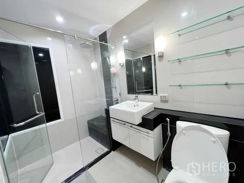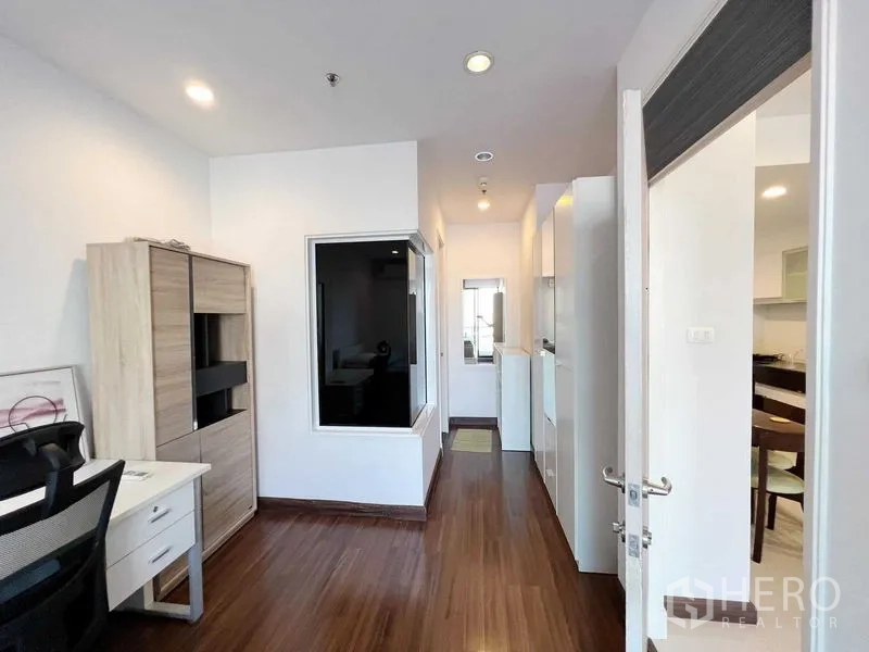 ให้เช่าคอนโด 1 ห้องนอน 1 ห้องน้ำ พื้นที่ใช้สอย 55 ตร.ม. ในย่านห้วยขวาง กรุงเทพฯ ผังห้องโปร่งสบาย รับแสงธรรมชาติ ครัวบิลท์อินพร้อมเตาและเครื่องดูดควัน ห้องน้ำทันสมัยพร้อมตู้กระจกอาบน้ำ และระเบียงส่วนตัวชมวิวเมือง สิ่งอำนวยความสะดวกครบครัน ได้แก่ สระว่ายน้ำ ฟิตเนส ล็อบบี้ต้อนรับ ที่จอดรถ และระบบรักษาความปลอดภัยตลอด 24 ชม. พร้อมคีย์การ์ด