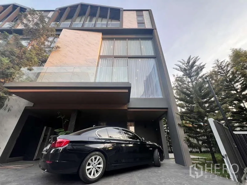 สัมผัสการอยู่อาศัยสมัยใหม่ในทาวน์เฮ้าส์ 3 ห้องนอน 4 ห้องน้ำ สำหรับขายในพระโขนง กรุงเทพฯ พื้นที่ใช้สอย 291 ตร.ม. บนที่ดิน 35 ตร.ว. (ประมาณ 140 ตร.ม. หรือราว 0.09 ไร่) โดดเด่นด้วยโถงรับแขกเพดานสูงโปร่งพร้อมกระจกเต็มบาน โซนรับประทานอาหาร และครัวปิดสไตล์ไทยเคาน์เตอร์ลายหินอ่อนพร้อมเตาแก๊ส ห้องนอนมาสเตอร์มีวอล์กอินคลอเซ็ตขนาดใหญ่ และห้องน้ำหรูพร้อมอ่างอาบน้ำและอ่างล้างหน้าคู่ ประตูกระจกบานเลื่อนเปิดสู่สนามหญ้าและคอร์ทยาร์ดจัดสวนส่วนตัว