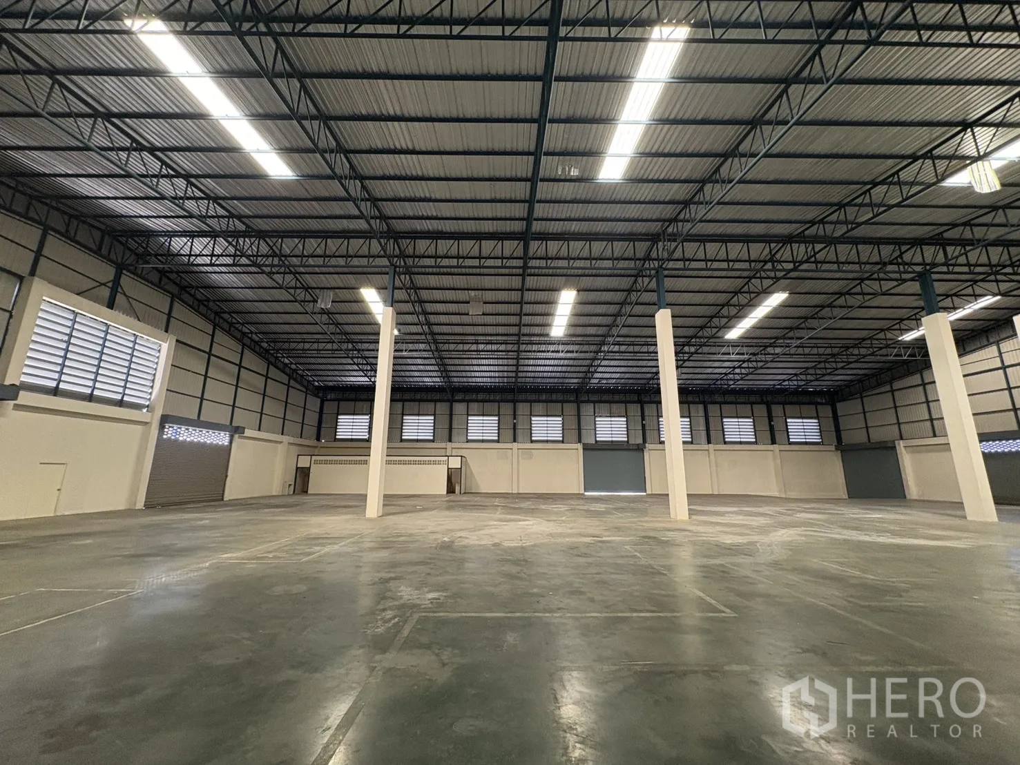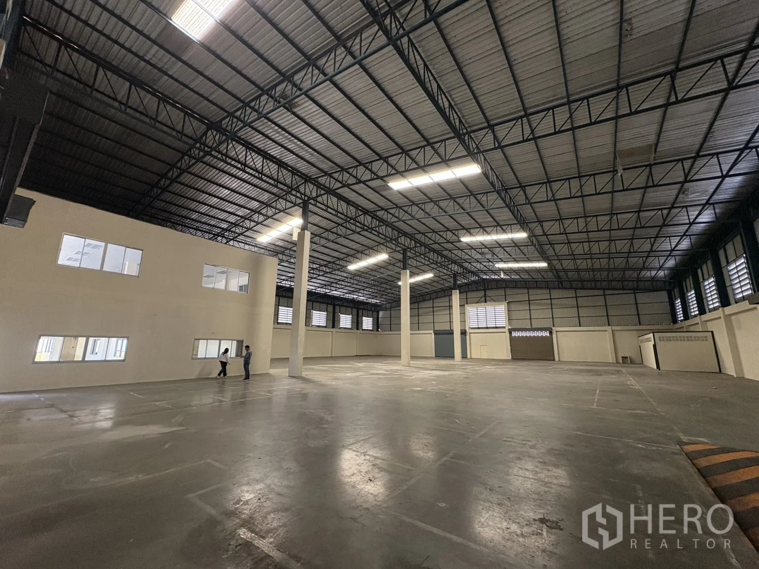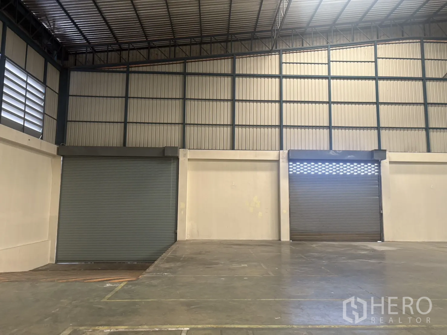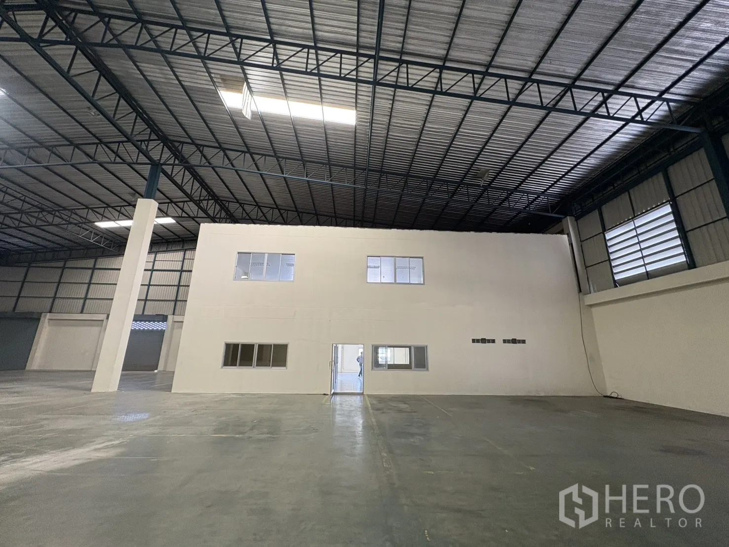 โกดังให้เช่าในทำเลบางบ่อ สมุทรปราการ พื้นที่ใช้สอย 2,232 ตร.ม. รวมออฟฟิศ 2 ชั้น ความสูงเคลียร์ประมาณ 8–10 ม. พื้นรับน้ำหนัก 3 ตัน/ตร.ม. พร้อมช่องโหลดแบบยกระดับ 4 จุด และทางลาด 1 จุด ประตูชัตเตอร์ไฟฟ้าและมือดึง ยกระดับพื้นราว +1.30 ม. มีระบบตรวจจับควันและทางหนีไฟครบครัน ลานฮาร์ดสแตนด์ด้านนอกประมาณ 3,226 ตร.ม. รองรับการจอดและกลับรถเทรลเลอร์ได้สะดวก
