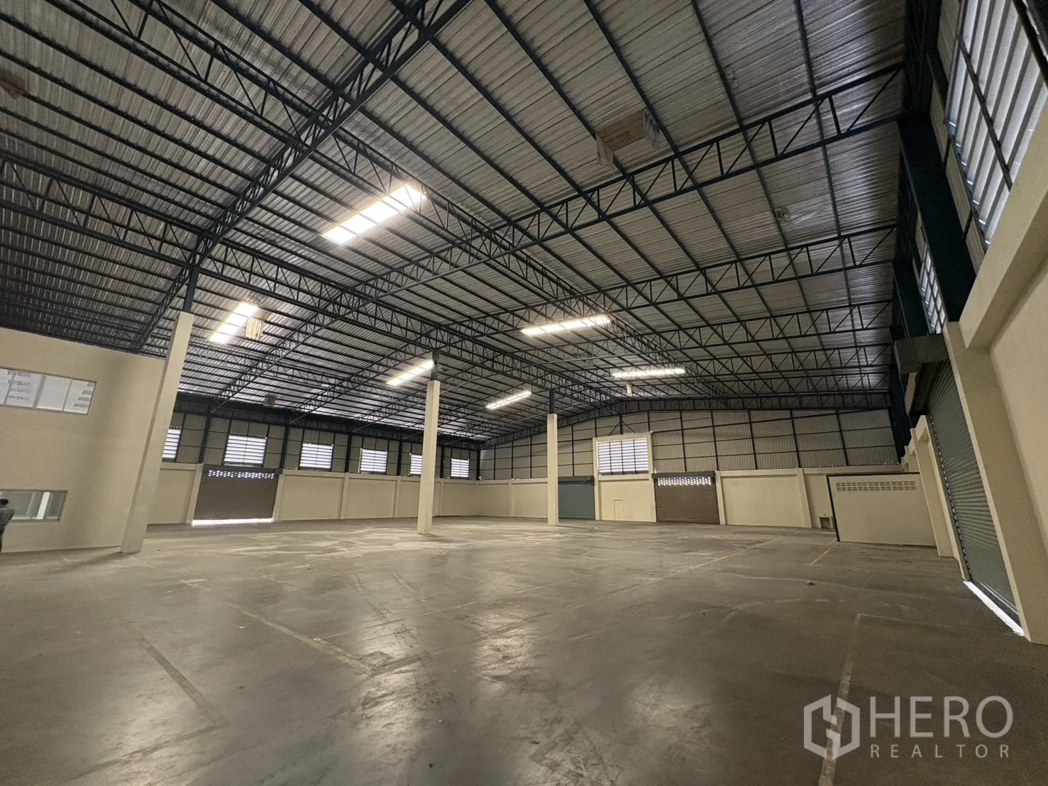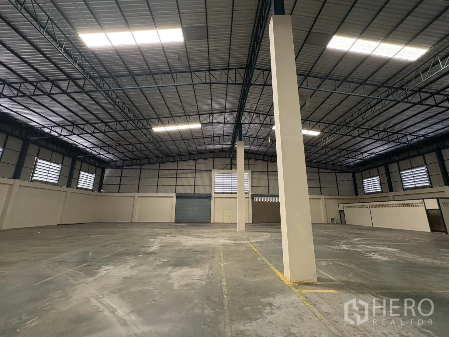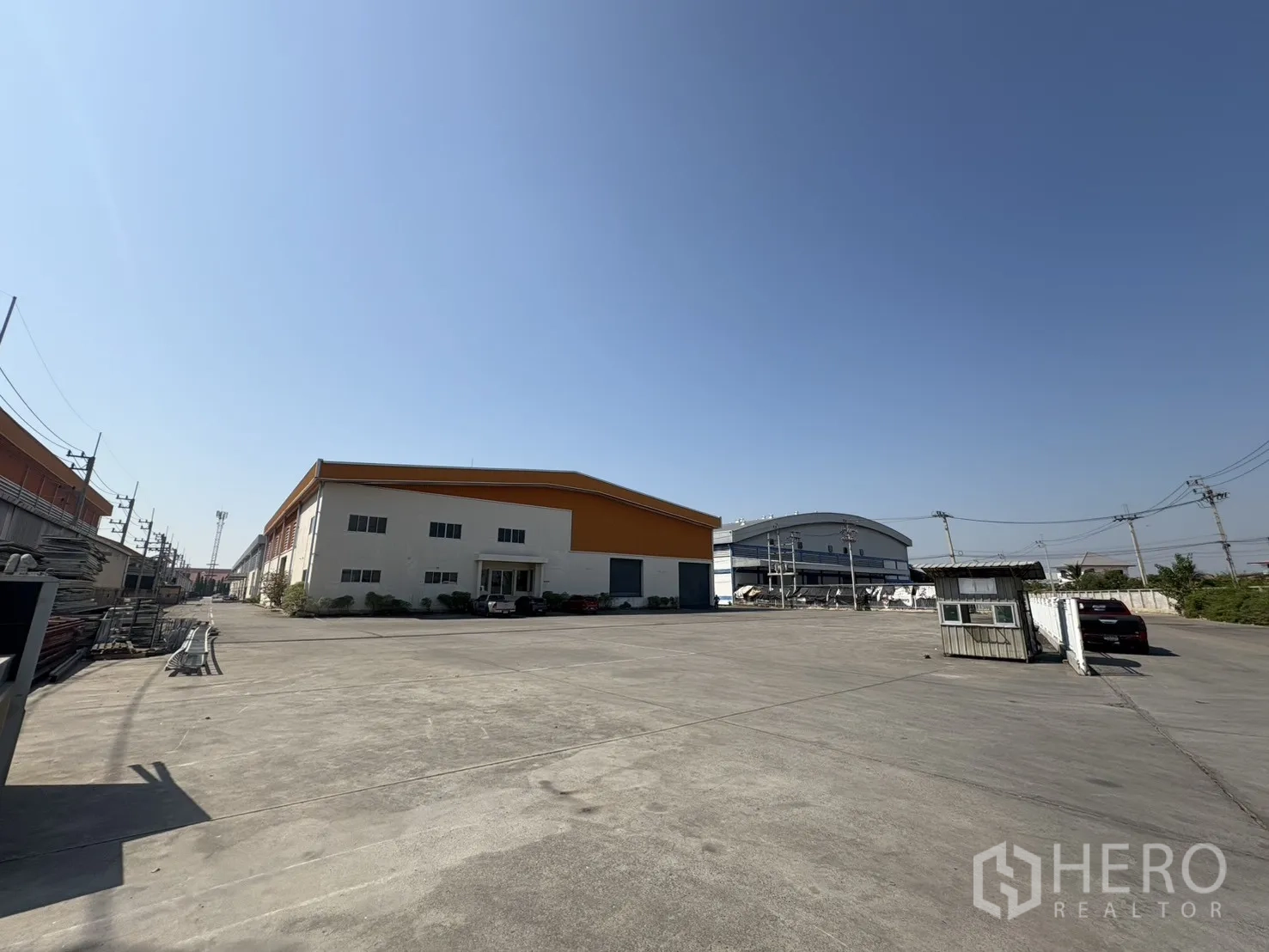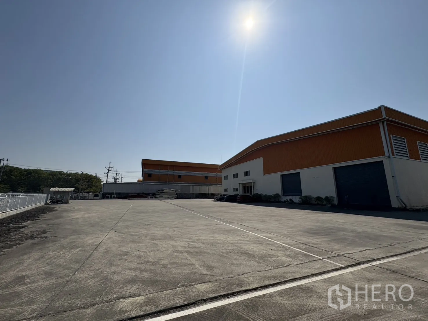 โกดังให้เช่าในทำเลบางบ่อ สมุทรปราการ พื้นที่ใช้สอย 2,232 ตร.ม. รวมออฟฟิศ 2 ชั้น ความสูงเคลียร์ประมาณ 8–10 ม. พื้นรับน้ำหนัก 3 ตัน/ตร.ม. พร้อมช่องโหลดแบบยกระดับ 4 จุด และทางลาด 1 จุด ประตูชัตเตอร์ไฟฟ้าและมือดึง ยกระดับพื้นราว +1.30 ม. มีระบบตรวจจับควันและทางหนีไฟครบครัน ลานฮาร์ดสแตนด์ด้านนอกประมาณ 3,226 ตร.ม. รองรับการจอดและกลับรถเทรลเลอร์ได้สะดวก