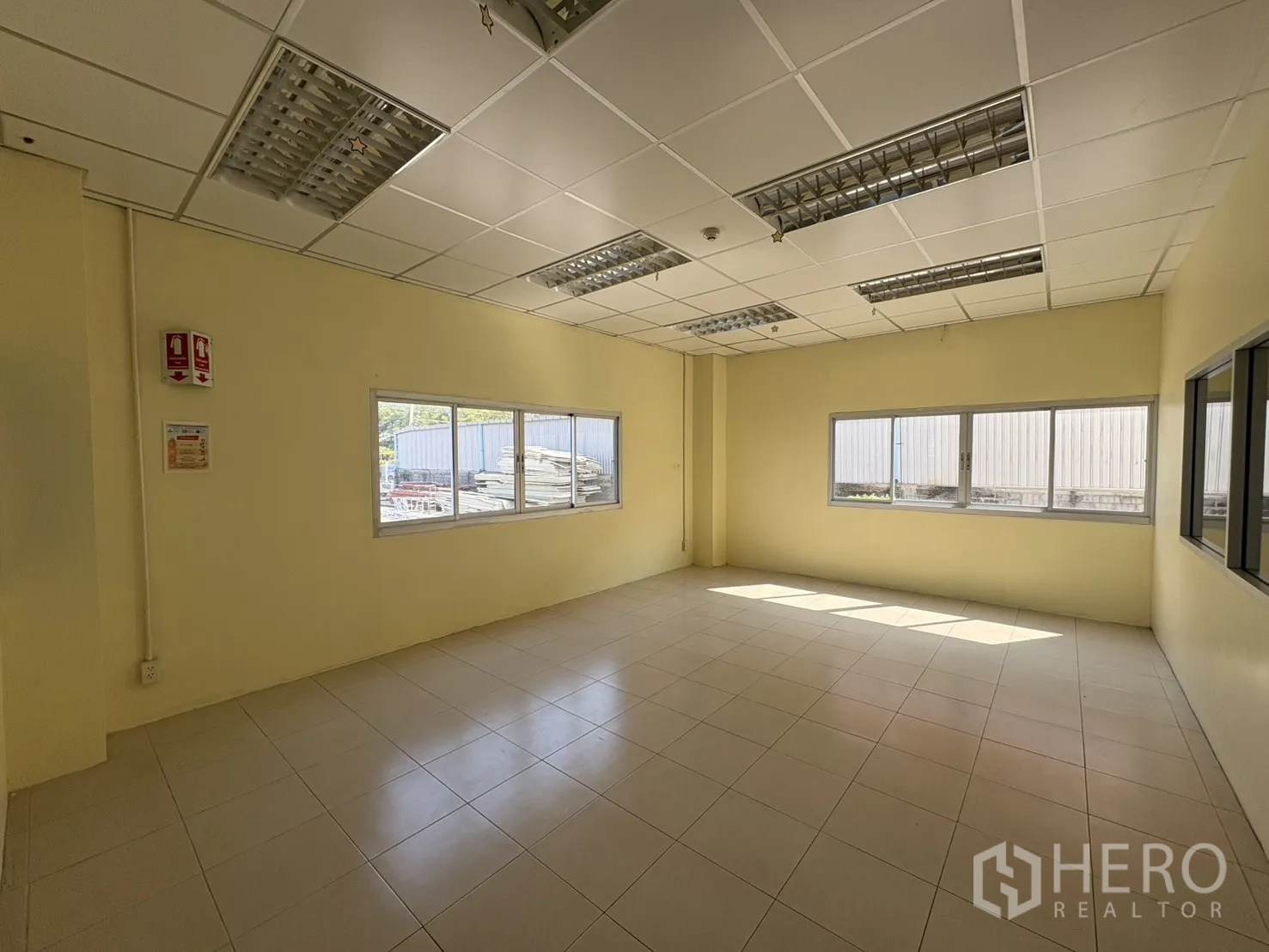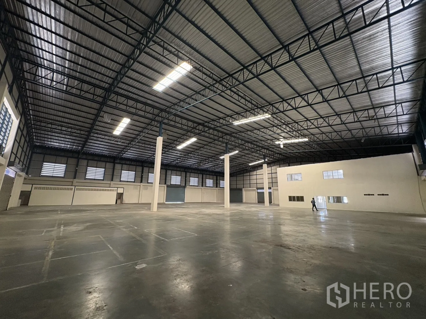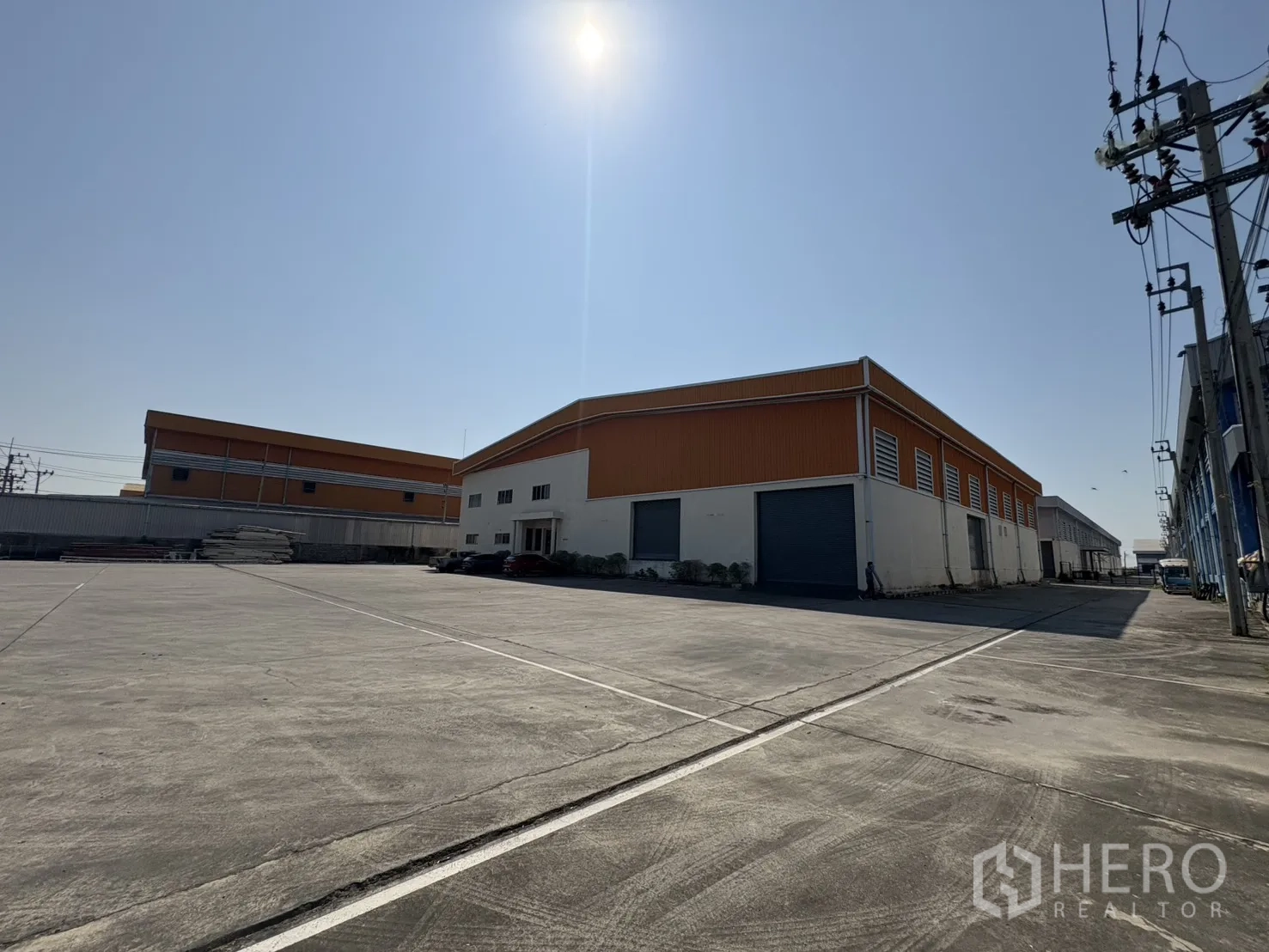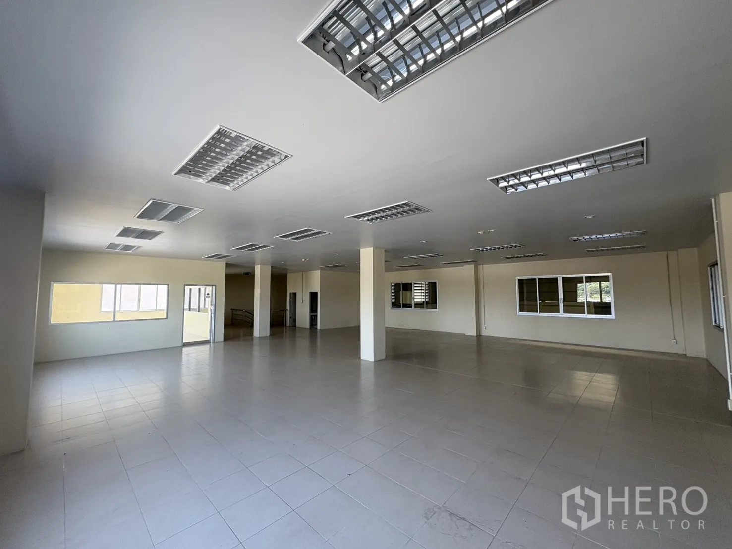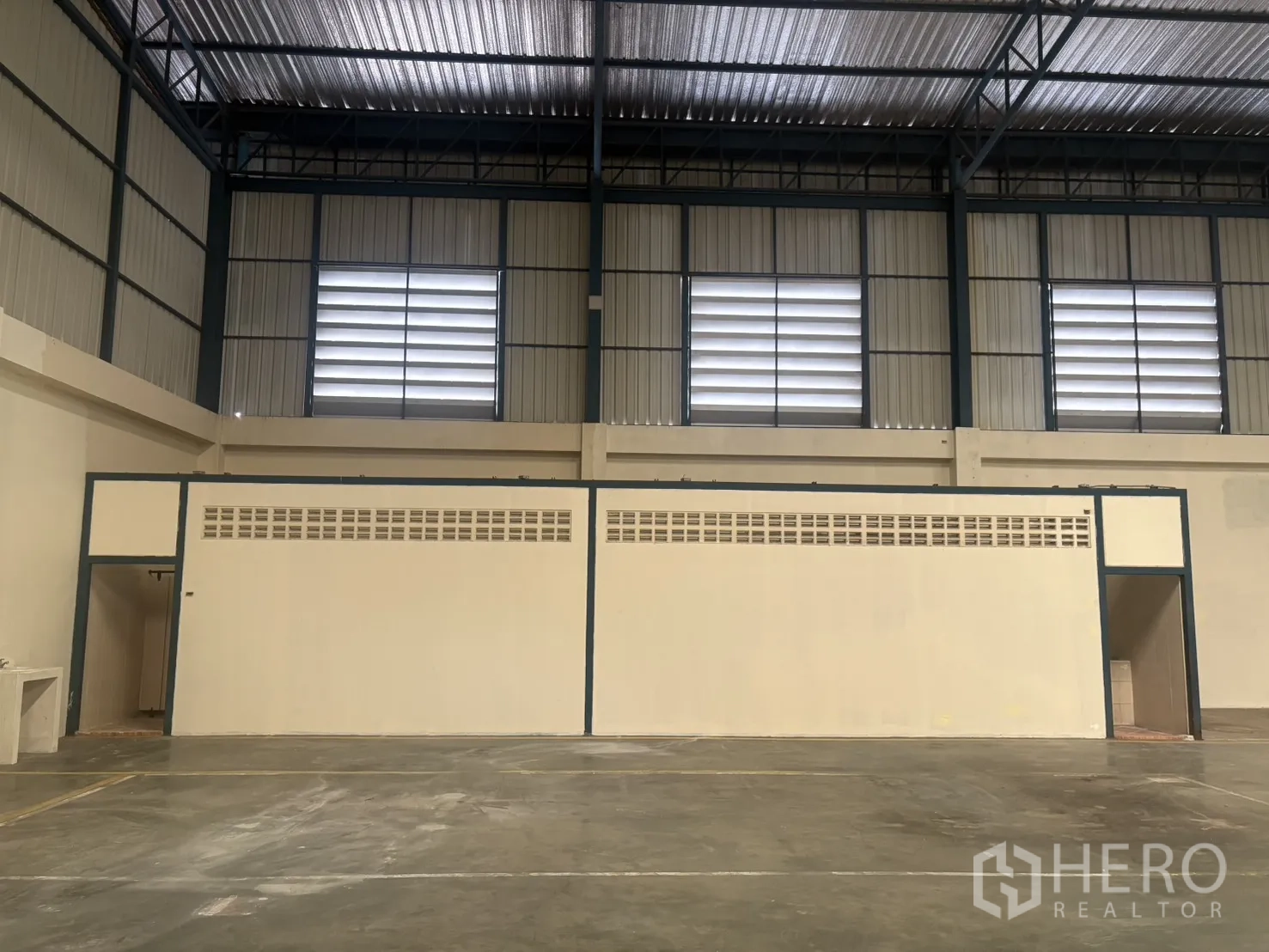 โกดังให้เช่าในทำเลบางบ่อ สมุทรปราการ พื้นที่ใช้สอย 2,232 ตร.ม. รวมออฟฟิศ 2 ชั้น ความสูงเคลียร์ประมาณ 8–10 ม. พื้นรับน้ำหนัก 3 ตัน/ตร.ม. พร้อมช่องโหลดแบบยกระดับ 4 จุด และทางลาด 1 จุด ประตูชัตเตอร์ไฟฟ้าและมือดึง ยกระดับพื้นราว +1.30 ม. มีระบบตรวจจับควันและทางหนีไฟครบครัน ลานฮาร์ดสแตนด์ด้านนอกประมาณ 3,226 ตร.ม. รองรับการจอดและกลับรถเทรลเลอร์ได้สะดวก