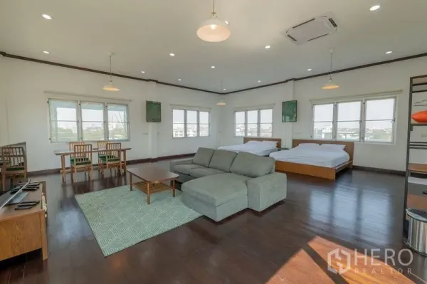 โฮมออฟฟิศ 8 ห้องนอน 6 ห้องน้ำ พื้นที่ใช้สอย 384 ตร.ม. หลายระดับ เหมาะอยู่อาศัยและทำงานในที่เดียว ที่ดิน 57 ตร.วา (ประมาณ 228 ตร.ม. หรือราว 0.14 ไร่) ภายในโปร่งโล่งด้วยประตูกระจกบานเลื่อนเปิดสู่ระเบียงและเทอเรซสวน รับแสงธรรมชาติเต็มที่ มีห้องรับประทานอาหาร/ห้องประชุมขนาดใหญ่ พื้นไม้สวย พร้อมตู้บิวท์อิน ใช้งานได้ยืดหยุ่นทั้งครอบครัวและทีมงาน