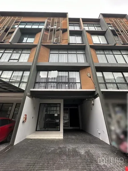 ทาวน์เฮ้าส์สมัยใหม่ 3 ห้องนอน 4 ห้องน้ำ ในเขตสวนหลวง พื้นที่ใช้สอย 185 ตร.ม. บนที่ดิน 25 ตร.ว. (ประมาณ 100 ตร.ม. หรือราว 0.06 ไร่) โถงรับแขกเพดานสูงรับแสงธรรมชาติจากหน้าต่างจรดพื้น พื้นเงางามให้บรรยากาศโมเดิร์น ครัวรูปตัวแอลพร้อมตู้ลายไม้ เคาน์เตอร์สีดำ เครื่องดูดควัน และหน้าต่างระบายอากาศ ห้องน้ำติดตั้งตู้กระจกอาบน้ำและสุขภัณฑ์คุณภาพ ประตูบานเลื่อนขนาดใหญ่เชื่อมต่อที่จอดรถและพื้นที่เก็บของ