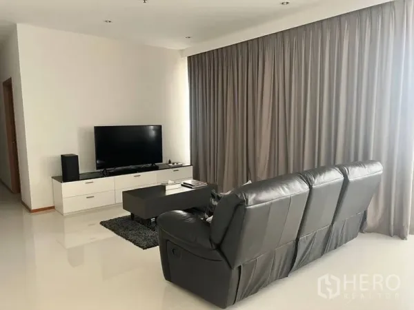 คอนโดขนาด 109 ตร.ม. 2 ห้องนอน 3 ห้องน้ำ โดดเด่นด้วยพื้นที่นั่งเล่นแบบโอเพ่นโปร่งสว่าง ผนังทีวีลายหินอ่อนและโคมไฟแชนเดอเลียร์ หน้าต่างบานใหญ่รับแสงธรรมชาติและวิวเมือง ห้องนอนปูพื้นไม้บรรยากาศอบอุ่น มีตู้เก็บของบิลท์อิน ห้องนอนหลักมาพร้อมวอล์กอินโคลเซ็ต และห้องน้ำในตัวที่มีอ่างอาบน้ำริมหน้าต่าง ส่วนห้องน้ำที่สามเหมาะสำหรับรับรองแขก