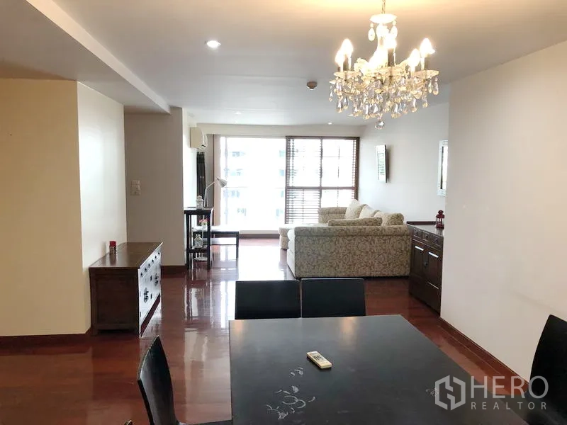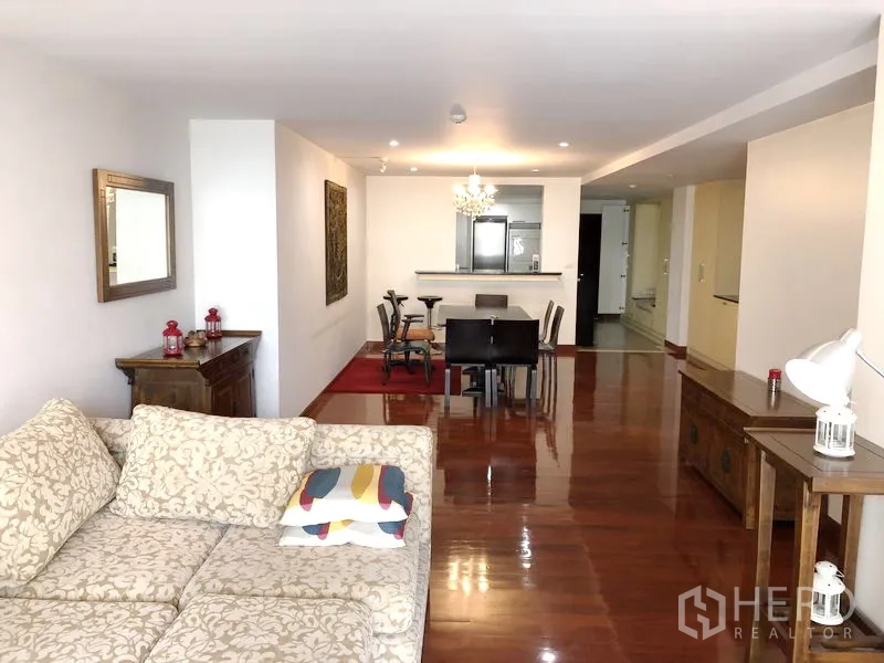 คอนโดขนาด 116 ตร.ม. 2 ห้องนอน 2 ห้องน้ำ ตอบโจทย์การอยู่อาศัยใจกลางเมืองย่านสุขุมวิท ใกล้ BTS นานา พื้นที่รับแขกและรับประทานอาหารแบบโอเพ่นแปลน ปูพื้นไม้เงางาม มีโคมไฟระย้าเด่นสะดุดตา ครัวรูปตัว U ติดตั้งครบด้วยเคาน์เตอร์หินแกรนิต เตาอบ เตาไฟฟ้า เครื่องล้างจาน และตู้เก็บของจำนวนมาก ห้องนอนโปร่งสว่าง โดยห้องหลักมีม้านั่งริมหน้าต่าง ตู้เสื้อผ้าบานกระจก และโต๊ะเครื่องแป้ง ห้องน้ำทันสมัยพร้อมอ่างอาบน้ำและฉากกั้นอาบน้ำกระจก