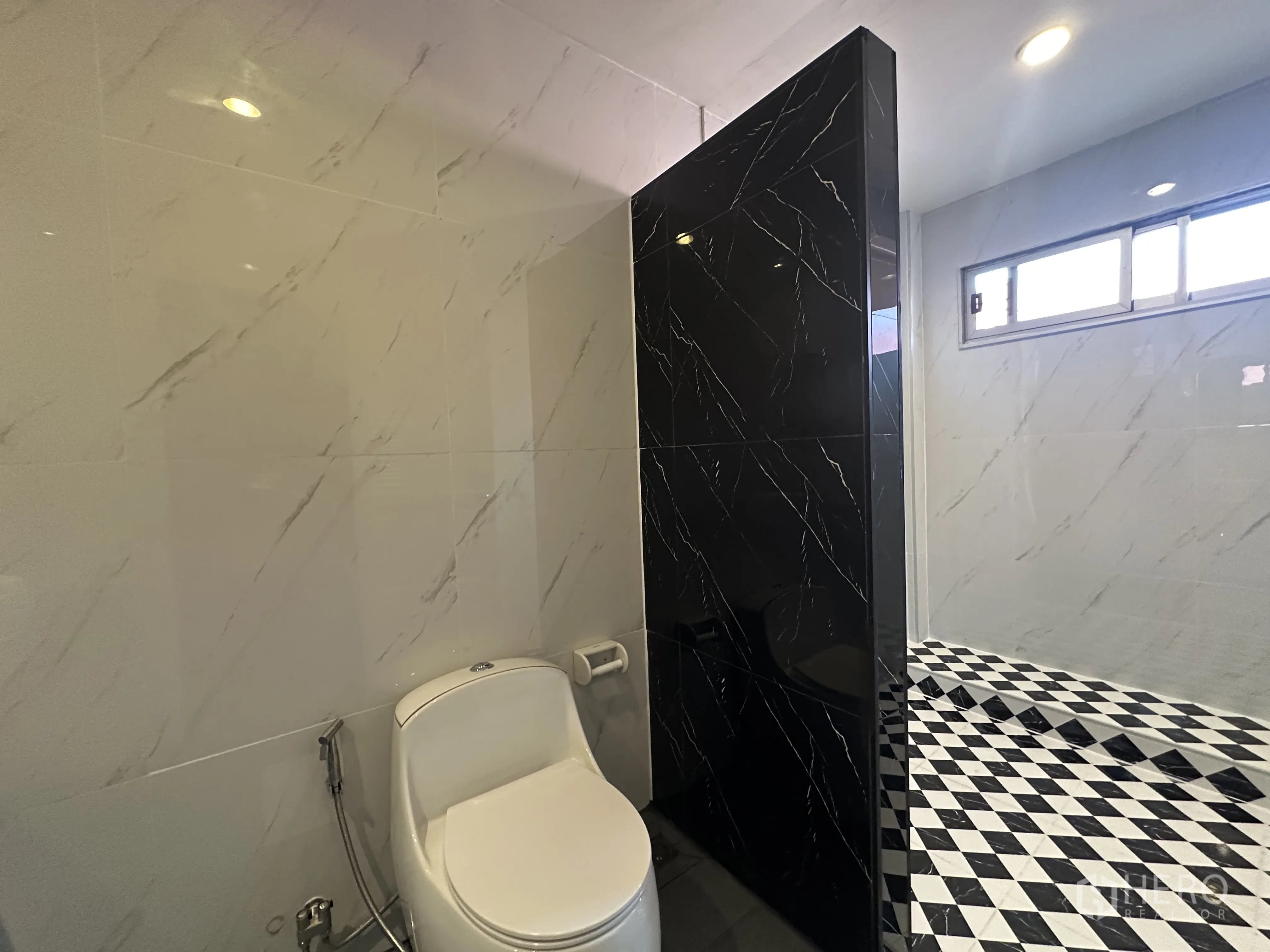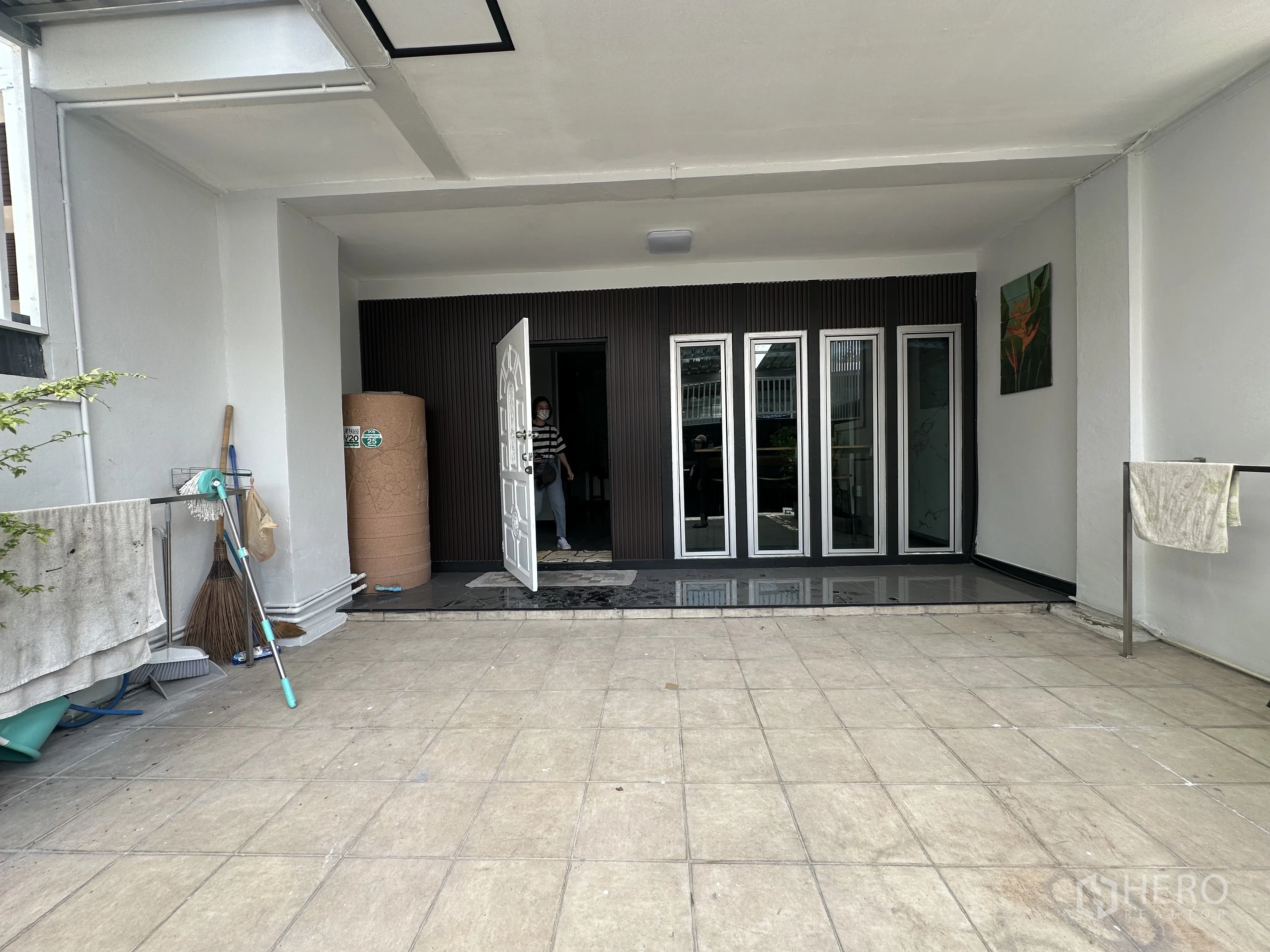 โฮมออฟฟิศปรับปรุงใหม่ให้เช่าใน Khlong Toei, Bangkok พื้นที่ใช้สอย 200 ตร.ม. บนที่ดิน 24 ตร.ว. (ประมาณ 96 ตร.ม. หรือราว 0.06 ไร่) หน้าบ้านมีประตูรั้วโลหะและพื้นที่มีหลังคา เหมาะสำหรับจอดรถ ภายในเป็นพื้นที่เปิดโล่งหลายชั้น ปูพื้นลายไม้และกระเบื้องโทนหิน ไฮไลต์ด้วยผนังลายหินอ่อน ไฟฝังฝ้า และโคมระย้า ช่องเปิดตรงกลางพร้อมทางเดินตะแกรงช่วยระบายอากาศและเพิ่มลูกเล่นสถาปัตยกรรม หน้าต่างและประตูกระจกบานเลื่อนขนาดใหญ่ช่วยให้โปร่งสบายตลอดวัน
