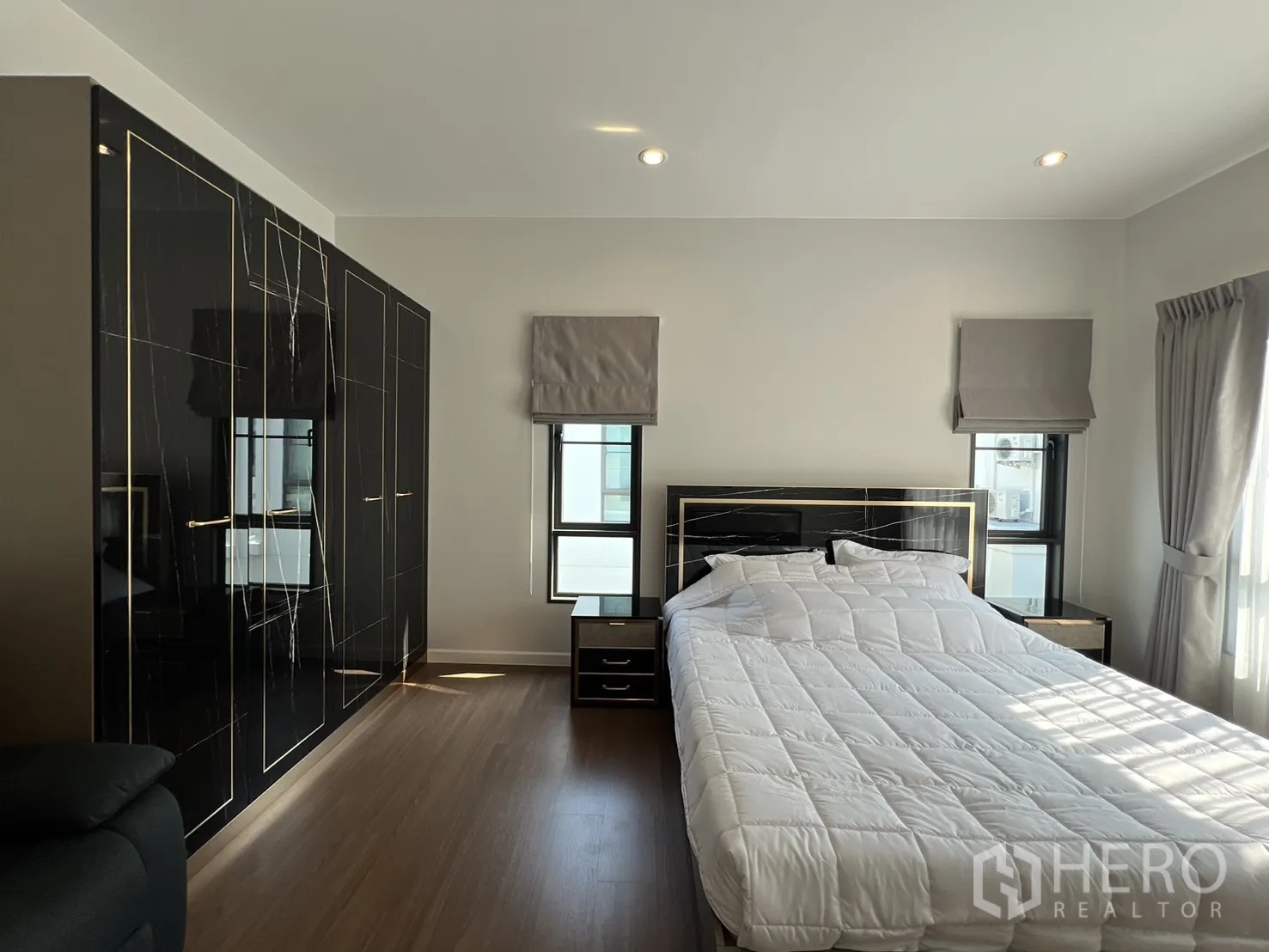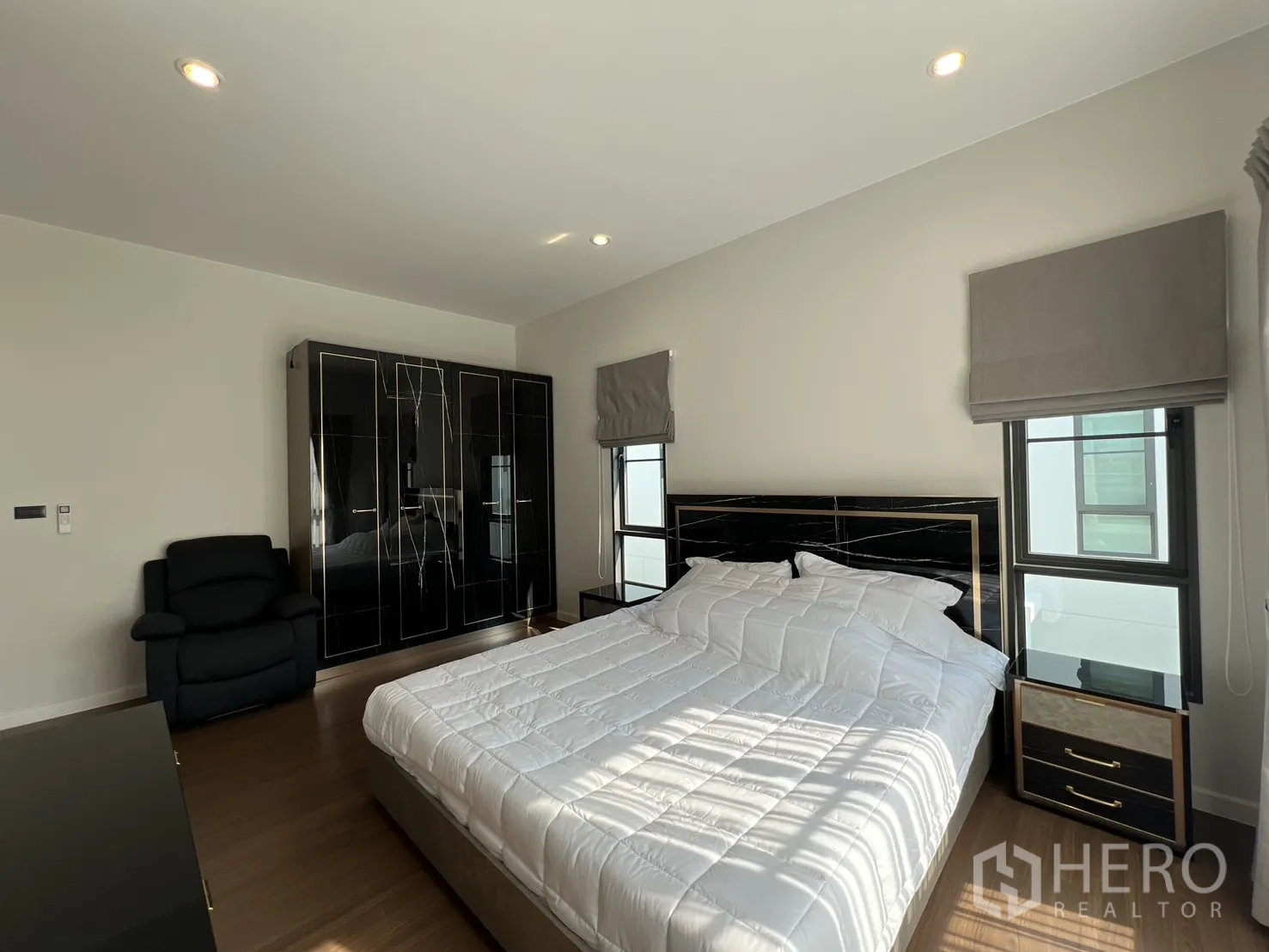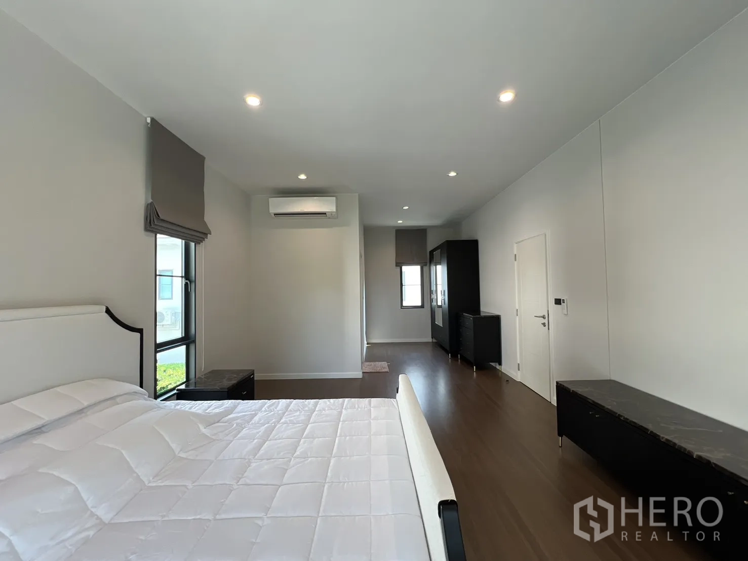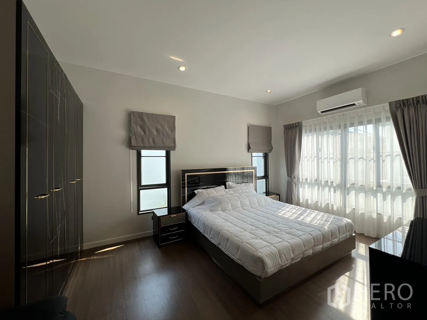บ้านเดี่ยวให้เช่าในอำเภอบางพลี จังหวัดสมุทรปราการ พื้นที่ใช้สอย 247 ตร.ม. ที่ดิน 59 ตร.ว. (ประมาณ 236 ตร.ม. หรือราว 0.15 ไร่) ภายในเป็นโซนนั่งเล่นและทานอาหารแบบเปิดโล่ง หน้าต่างบานใหญ่พร้อมม่านโปร่งและทึบ พื้นโทนสว่าง และฝ้าหลุมไฟซ่อน ให้บรรยากาศหรูหราเหมาะแก่การพักผ่อนและรับรองแขก จัดสรร 4 ห้องนอน 4 ห้องน้ำ แยกเป็นสัดส่วนสองชั้นเพื่อความเป็นส่วนตัวของสมาชิกในบ้าน