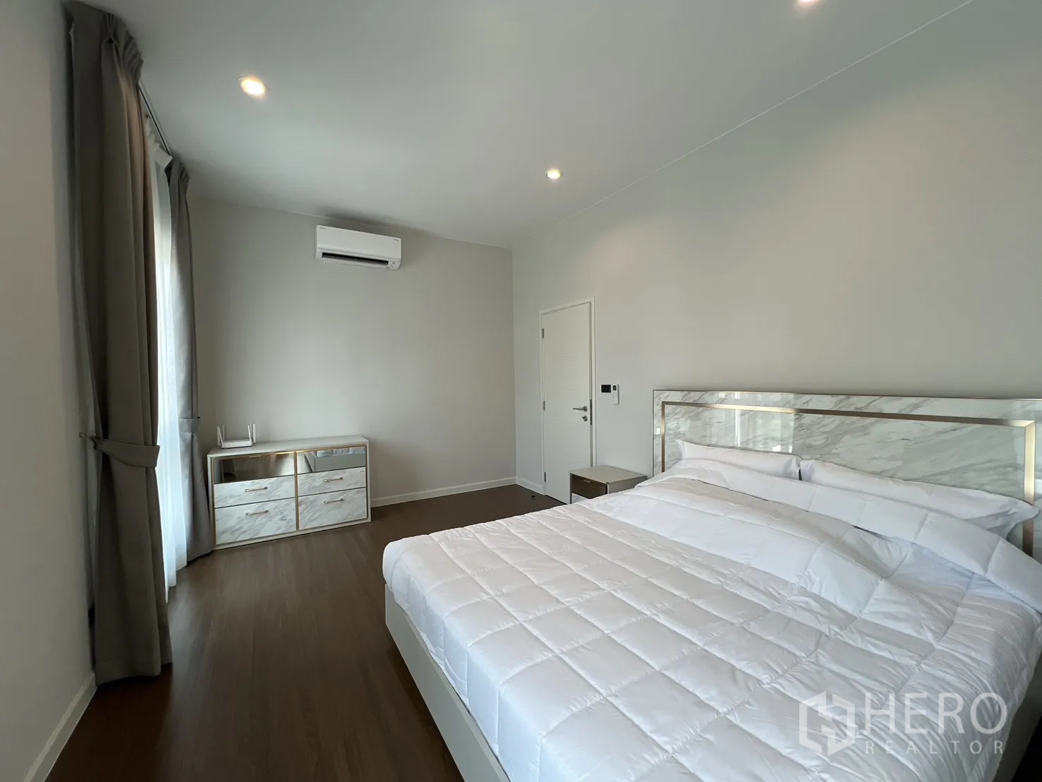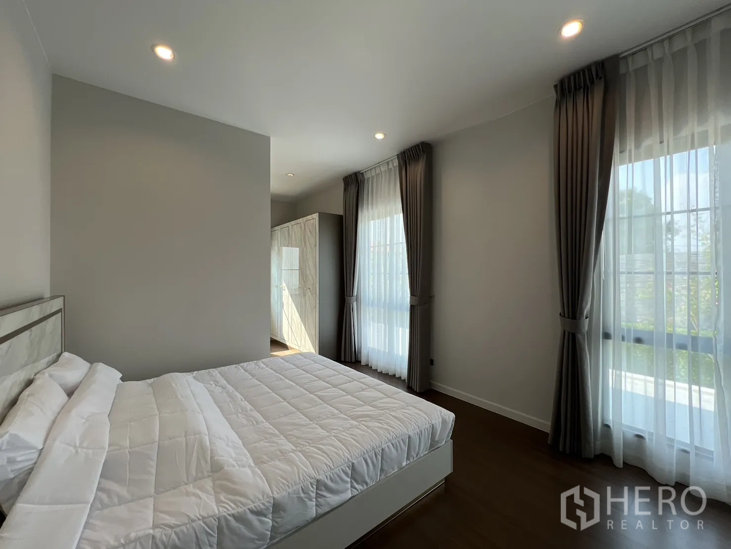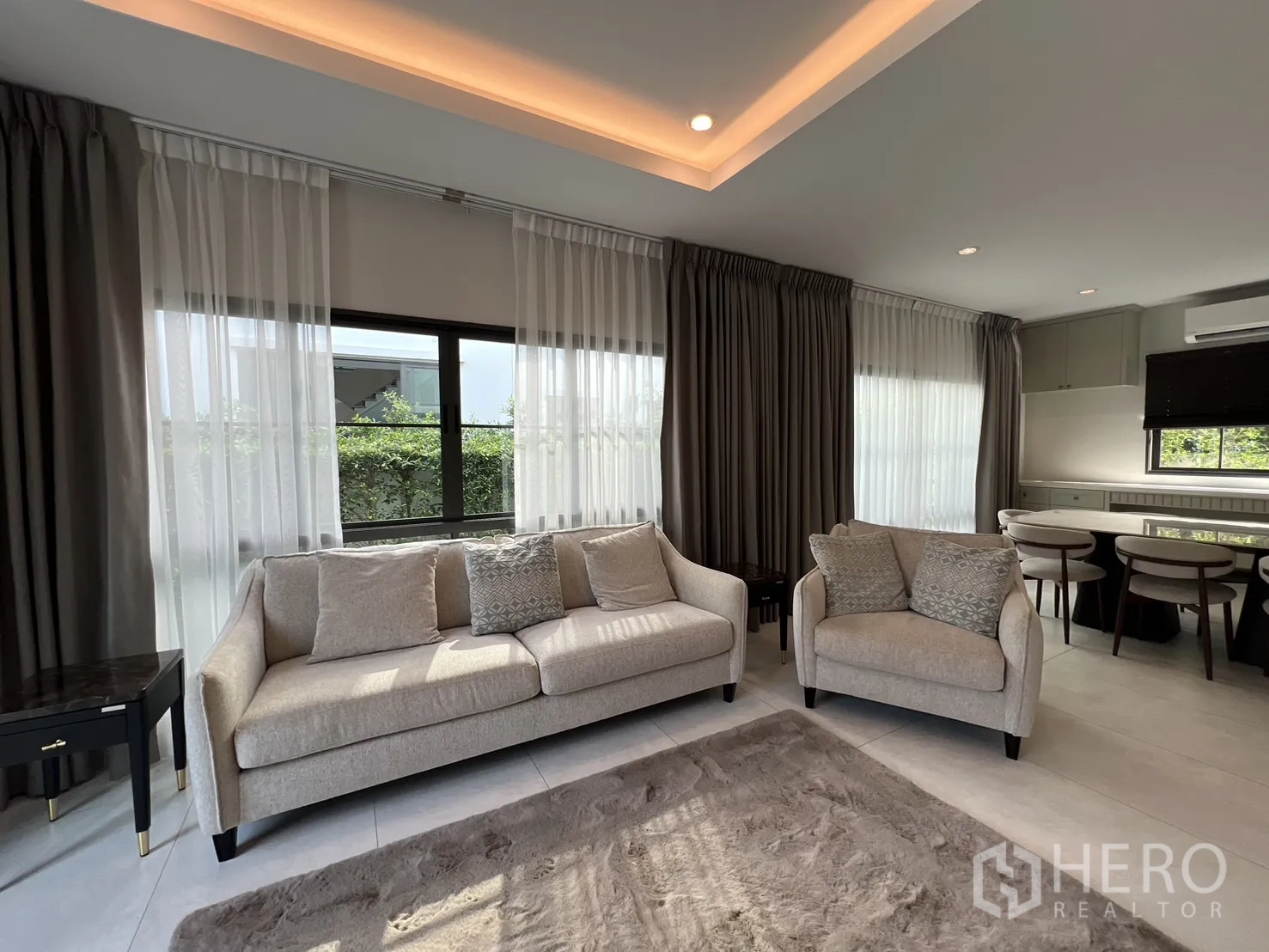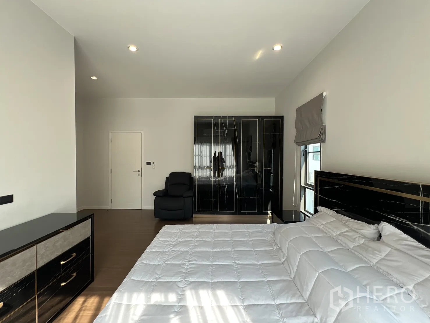 บ้านเดี่ยวให้เช่าในอำเภอบางพลี จังหวัดสมุทรปราการ พื้นที่ใช้สอย 247 ตร.ม. ที่ดิน 59 ตร.ว. (ประมาณ 236 ตร.ม. หรือราว 0.15 ไร่) ภายในเป็นโซนนั่งเล่นและทานอาหารแบบเปิดโล่ง หน้าต่างบานใหญ่พร้อมม่านโปร่งและทึบ พื้นโทนสว่าง และฝ้าหลุมไฟซ่อน ให้บรรยากาศหรูหราเหมาะแก่การพักผ่อนและรับรองแขก จัดสรร 4 ห้องนอน 4 ห้องน้ำ แยกเป็นสัดส่วนสองชั้นเพื่อความเป็นส่วนตัวของสมาชิกในบ้าน