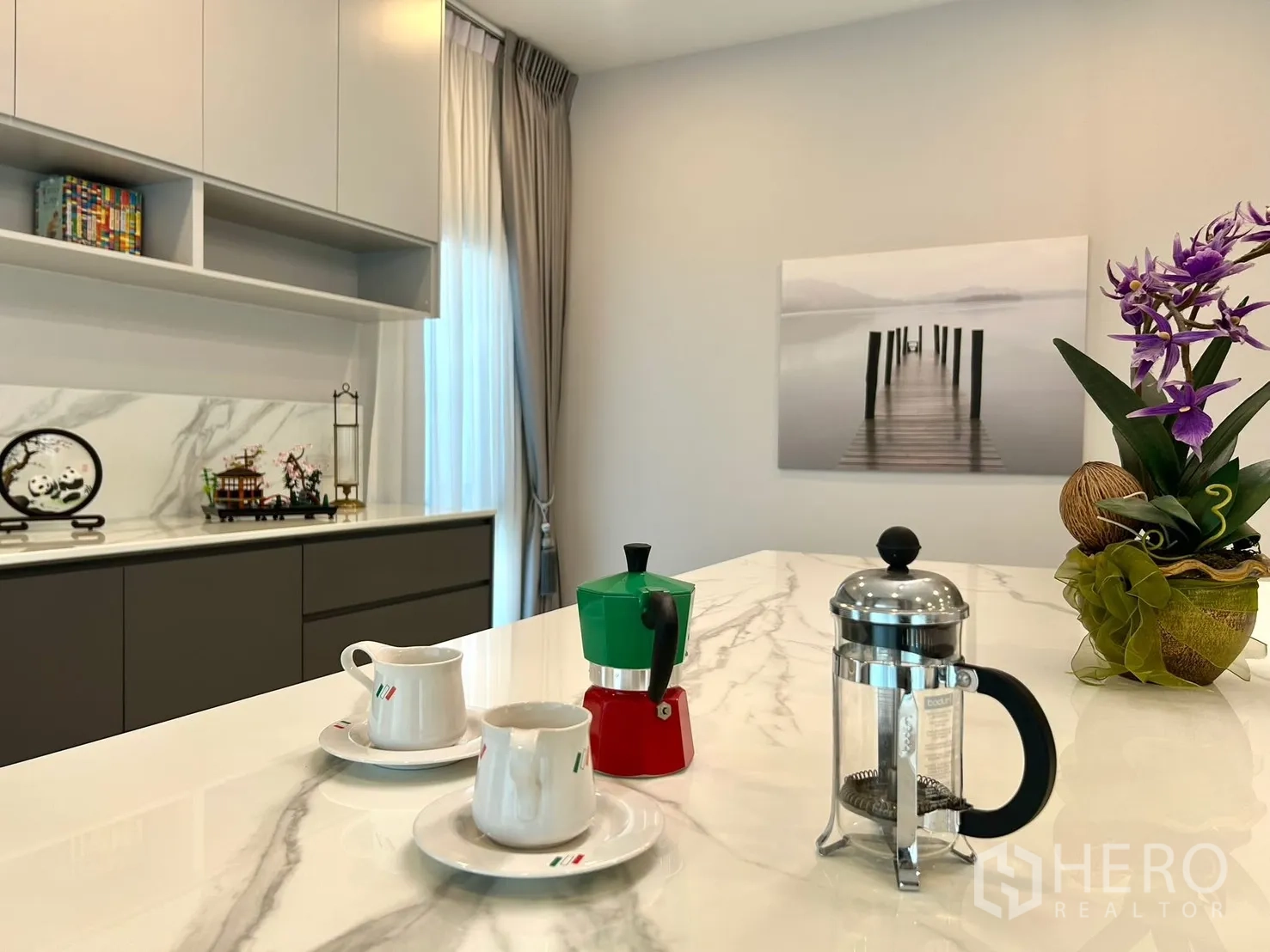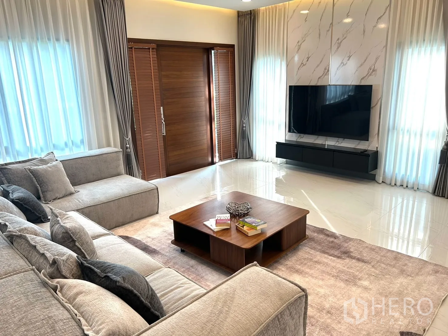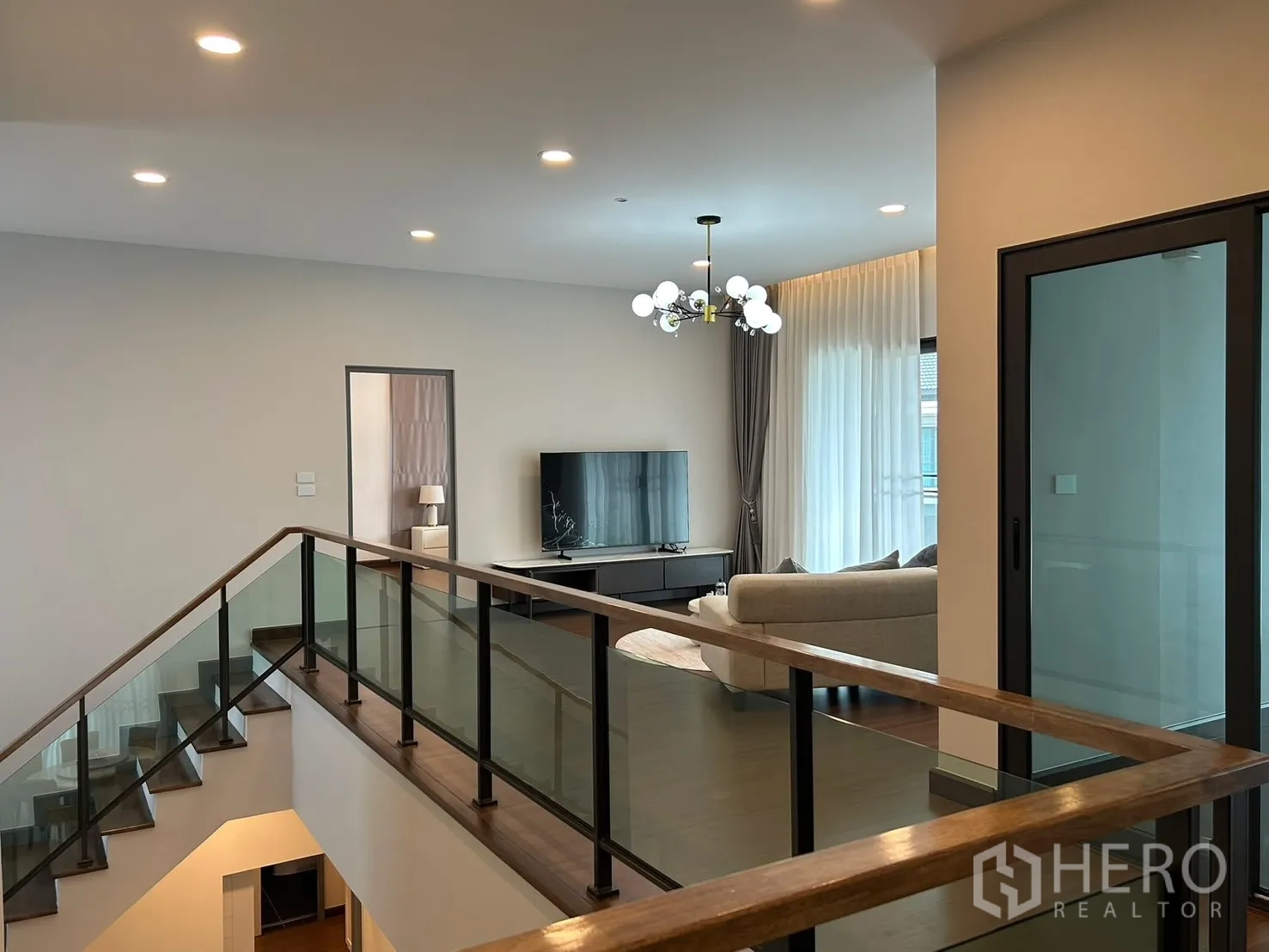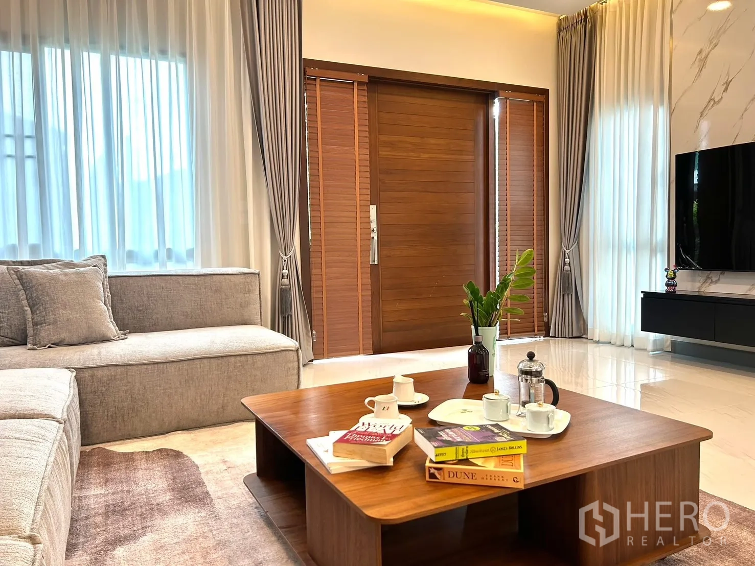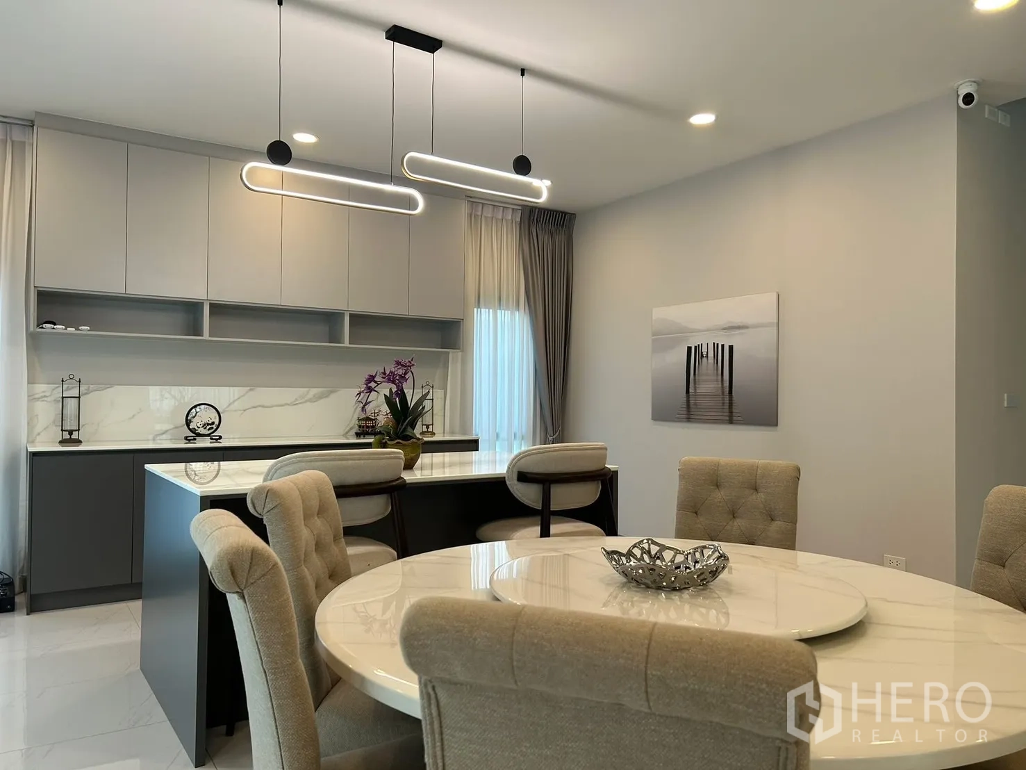 ชั้นล่างเป็นโถงรับแขกและทานอาหารแบบโอเพนแปลน พื้นกระเบื้องเงา มีผนังติดทีวีและผ้าม่านสูงจรดเพดาน ครัวไอส์แลนด์ท็อปลายหินอ่อนพร้อมโคมไฟห้อยช่วยเสริมความหรูทันสมัย ชั้นบนมีสเปซนั่งเล่นส่วนกลางพร้อมโคมไฟระย้า ห้องนอนหลักปูพื้นไม้และผ้าม่านขนาดใหญ่ ห้องอื่นๆ ขนาดพอเหมาะและมีห้องน้ำหลายจุด ภายนอกเป็นบ้านสองชั้นสไตล์ร่วมสมัย มีระเบียงและที่จอดรถในร่ม 2 คัน ติดกับสนามหญ้าสีเขียว ทำเลบางพลีเดินทางสะดวกสู่แหล่งไลฟ์สไตล์สำคัญของย่าน เช่น เมกะบางนา อิเกีย บางนา และสนามบินสุวรรณภูมิ สนใจเช่าบ้านหลังนี้ ติดต่อเราเพื่อนัดชมได้ทันที