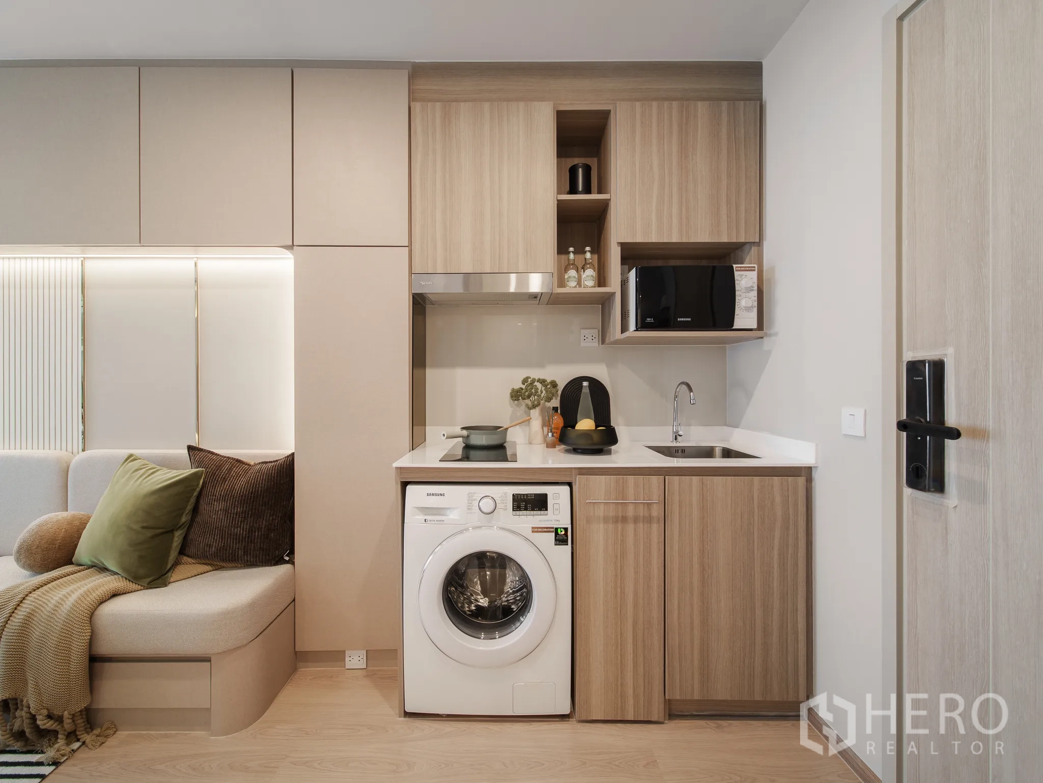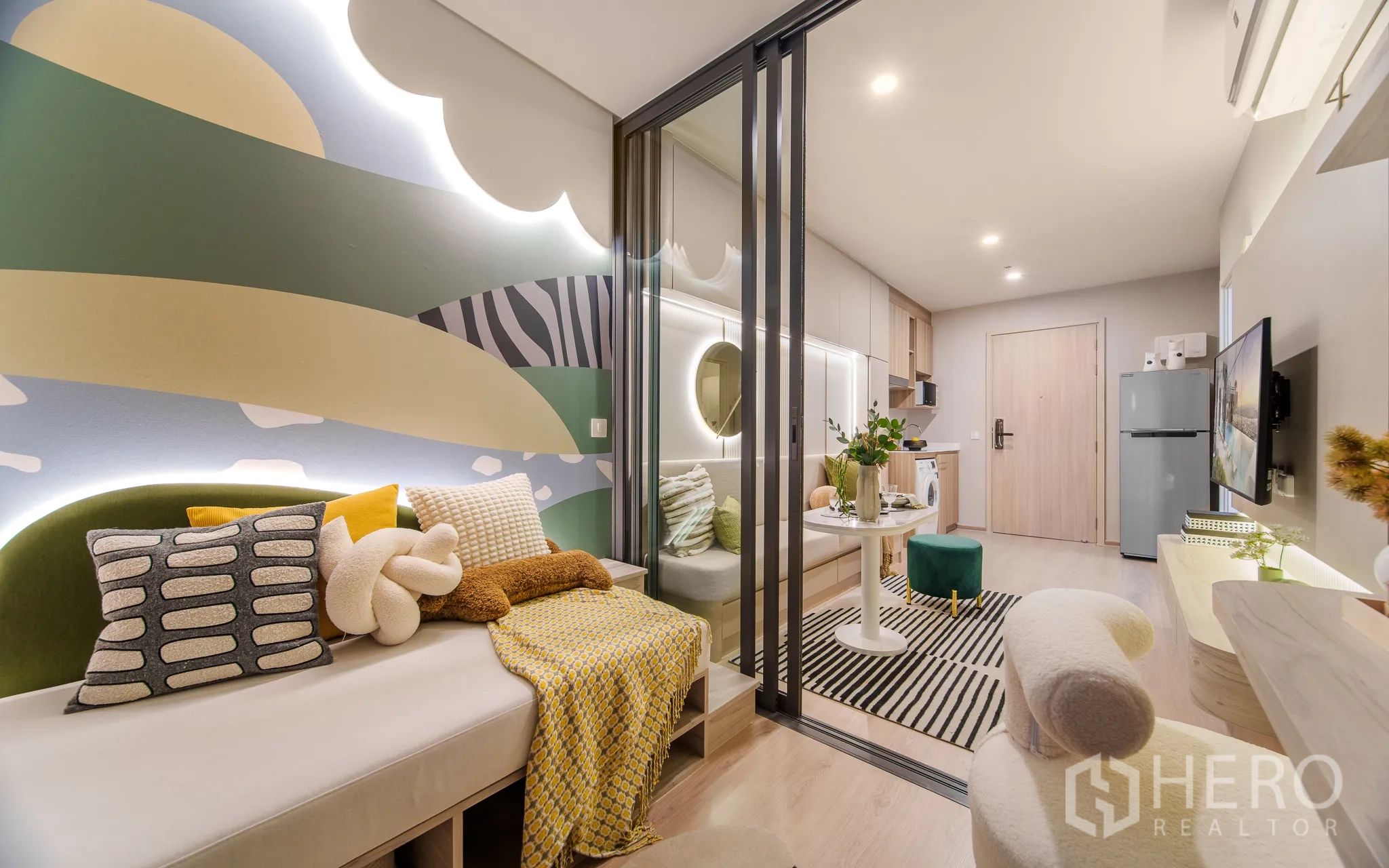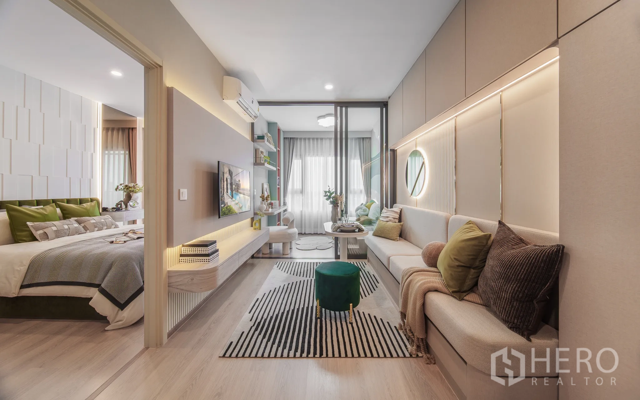 คอนโดมิเนียม 1 ห้องนอน 1 ห้องน้ำสำหรับขายในเขตคลองเตย กรุงเทพฯ พื้นที่ใช้สอย 35 ตร.ม. ออกแบบลงตัวสไตล์โมเดิร์น โซนรับแขกและทานข้าวแบบโอเพนสเปซ ปูพื้นลายไม้ ให้บรรยากาศอบอุ่น พร้อมชั้นวางและชั้นทีวีแบบลอยตัว หน้าต่างบานใหญ่พร้อมม่านสองชั้นช่วยรับแสงธรรมชาติ ผนังตกแต่งกระจกช่วยขยายมิติของห้อง ห้องนอนกั้นสไลด์แยกส่วน มีระเบียงมุมมองเมือง โคมไฟห้อย ศีรษะเตียงดีไซน์เด่น และโต๊ะเครื่องแป้งบิลต์อิน พร้อมชั้นเก็บของใช้งานได้จริง