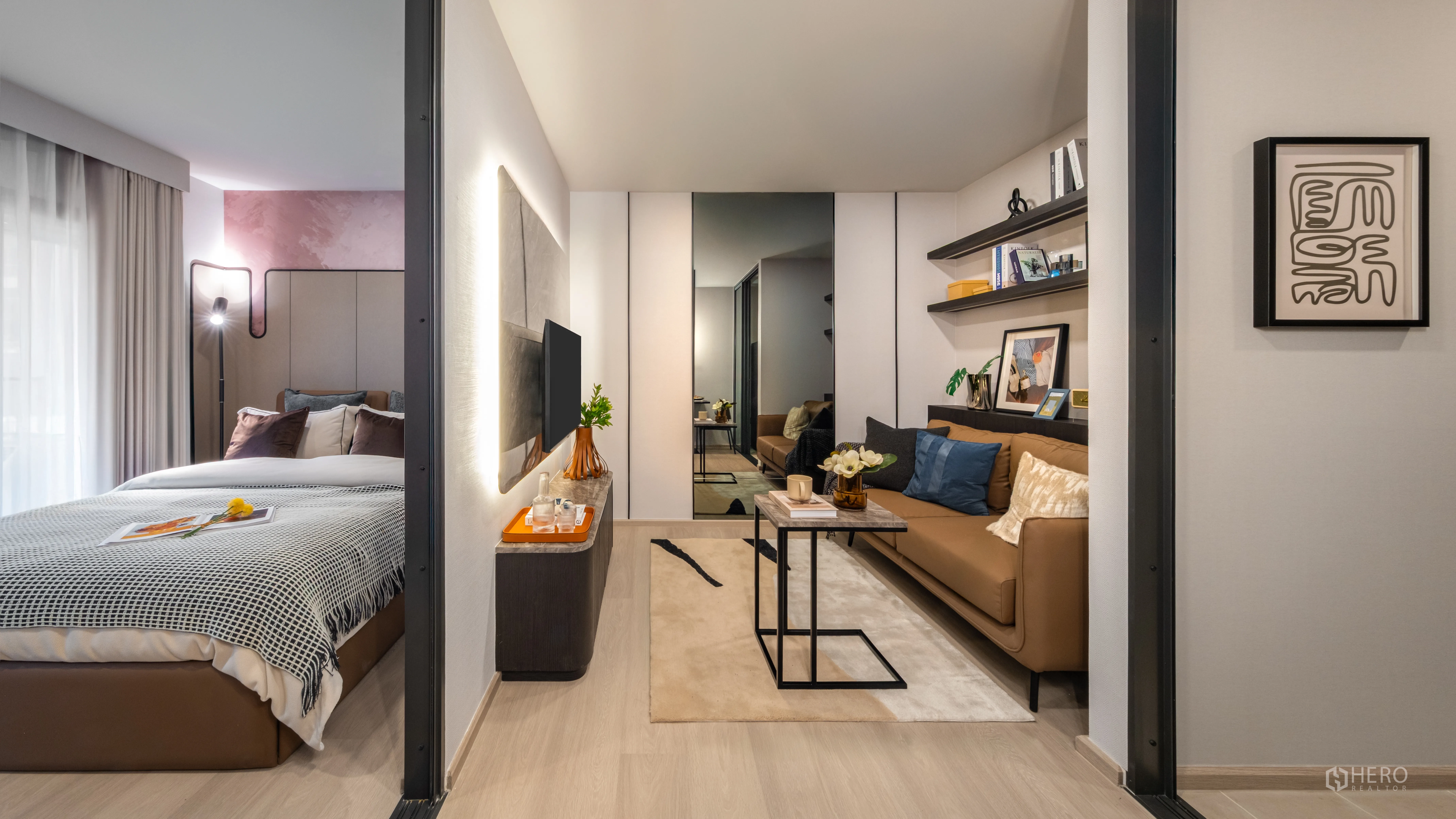 คอนโดมิเนียมสำหรับขายในเขตคลองเตย กรุงเทพมหานคร แบบ 2 ห้องนอน 2 ห้องน้ำ โดดเด่นด้วยเลย์เอาต์รวมยูนิตที่ให้พื้นที่ใช้สอยมากขึ้น ประมาณ 62 ตร.ม. (~15.5 ตารางวา หรือ ~0.039 ไร่) ภาพแสดงบรรยากาศร่วมสมัย โปร่งสว่างด้วยกระจกเต็มบาน เห็นวิวเมืองกว้าง โทนไม้เรียบหรู มุมนั่งเล่นหลายจุด และตู้บิลท์อินพร้อมงานศิลป์ เลาจน์กระจกโดยรอบเชื่อมต่อสู่เทอเรซจัดสวน เหมาะสำหรับพักผ่อนหรือรองรับแขกพร้อมชมสกายไลน์กรุงเทพฯ