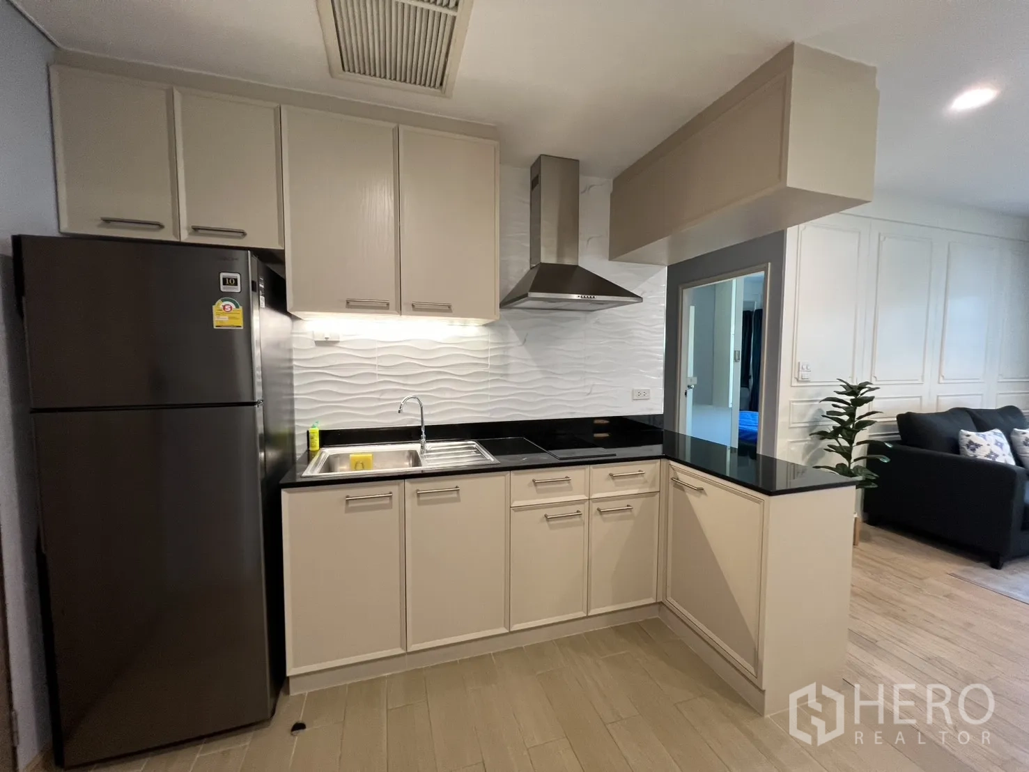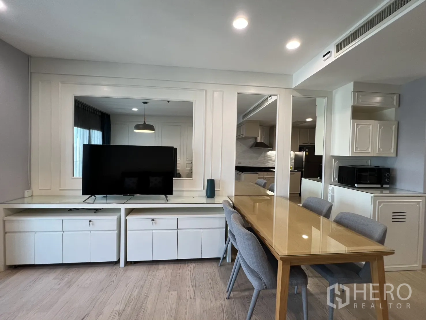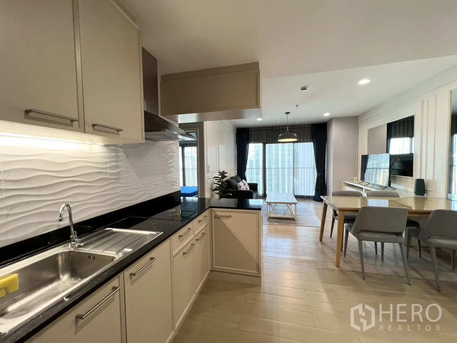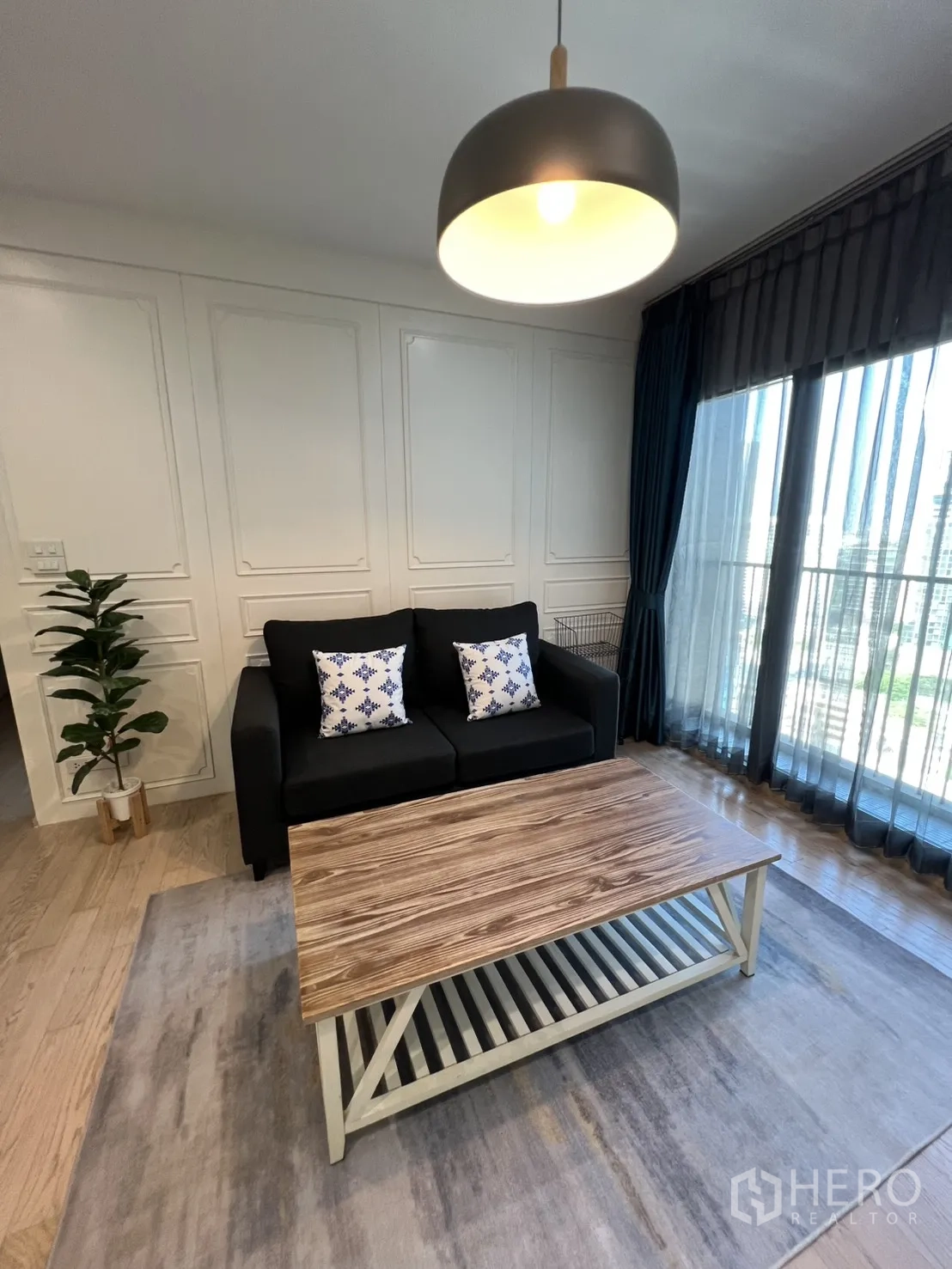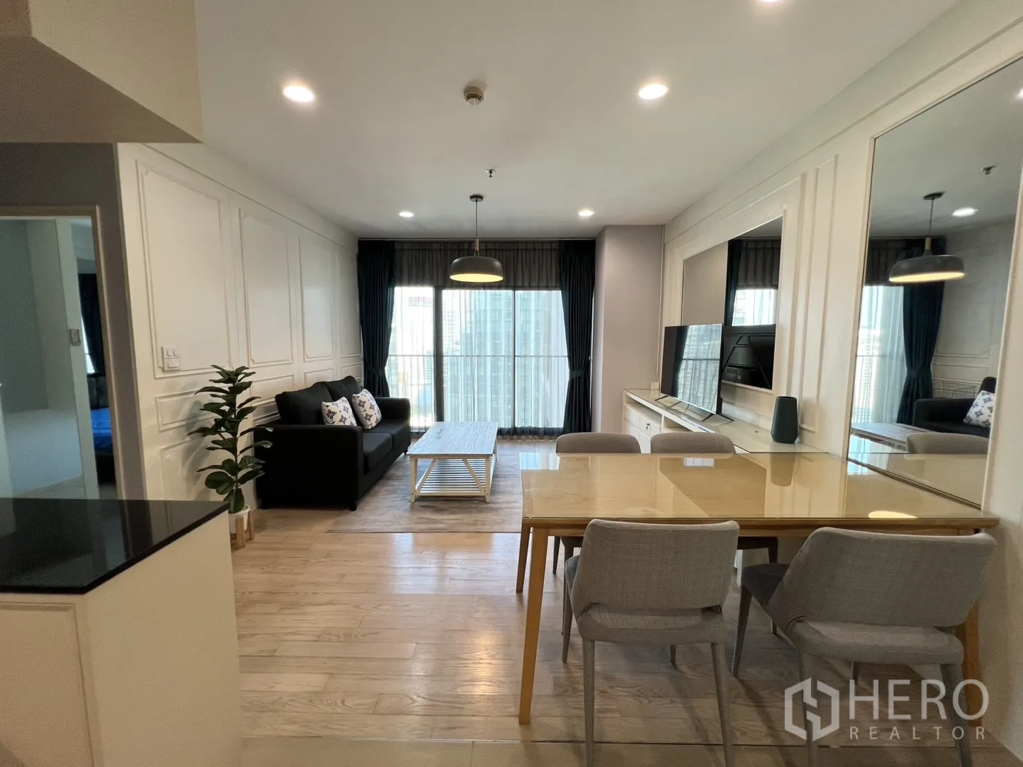 คอนโดมิเนียมให้เช่า 2 ห้องนอน 2 ห้องน้ำ ชั้นสูง ในเขตคลองเตย กรุงเทพฯ พื้นที่ใช้สอย 82 ตร.ม. (ประมาณ 20.5 ตร.วา หรือ ~0.051 ไร่) ห้องนั่งเล่นโปร่งสว่างด้วยกระจกเต็มบานพร้อมม่านกรองแสงและม่านทึบ พื้นไม้โทนอ่อน โคมไฟแขวน และตู้บิลต์อินสำหรับวางทีวี เฟอร์นิเจอร์ครบทั้งโซฟา เก้าอี้วิงแบ็ก และโต๊ะกลางไม้ มุมมองเมืองช่วยเพิ่มบรรยากาศทันสมัยและน่าอยู่