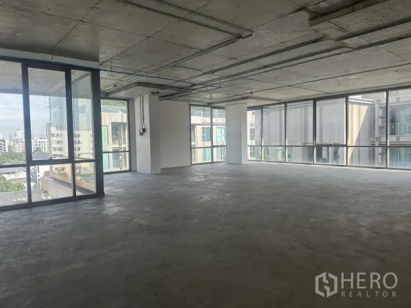 这间81㎡转角办公室位于曼谷帕卡隆区,步行可达BTS Punnawithi。开放式格局两侧采用整面落地玻璃,木纹地面与外露天花射灯,采光通风优越,适合协作工位、工作室或展示空间。双扇玻璃门与充足电源点,便于快速定制装修,窗外都市景致带来舒适的办公氛围。
