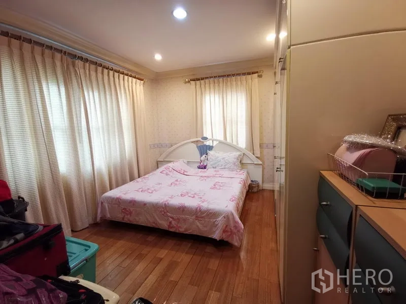 这座优雅的独栋别墅位于Phra Khanong区Bang Chak的高端Nanthawan社区,实用面积约453平方米,土地369平方哇(约1,476平方米,约0.92莱)。室内设有多功能客厅,石材地面与木格天花相映成趣;明亮餐区相连。U形厨房提供充足收纳与大理石台面。全屋共4卧5卫,主卧挑高木顶,套内卫浴配双台盆、浴缸与独立淋浴间。