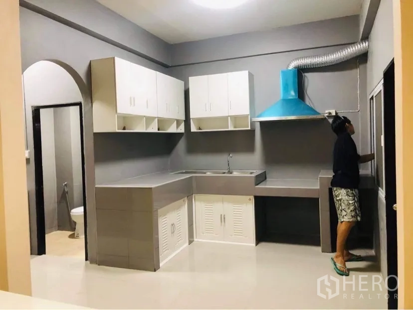 本联排别墅位于曼谷 Huai Khwang 区 Samsen Nok,4卧2卫,实用面积约220平方米。土地29平方华(约116平方米,约0.073莱)。室内设通透客餐厅,亮面瓷砖与大窗采光充足并配空调;内置厨房带充足柜体、耐用台面、双水槽与抽油烟机。卧室面积实用,可设置衣柜;卫浴升级配备洗手台与镜柜。前方为宽敞有顶露台,可用作安全车位,带推拉门。