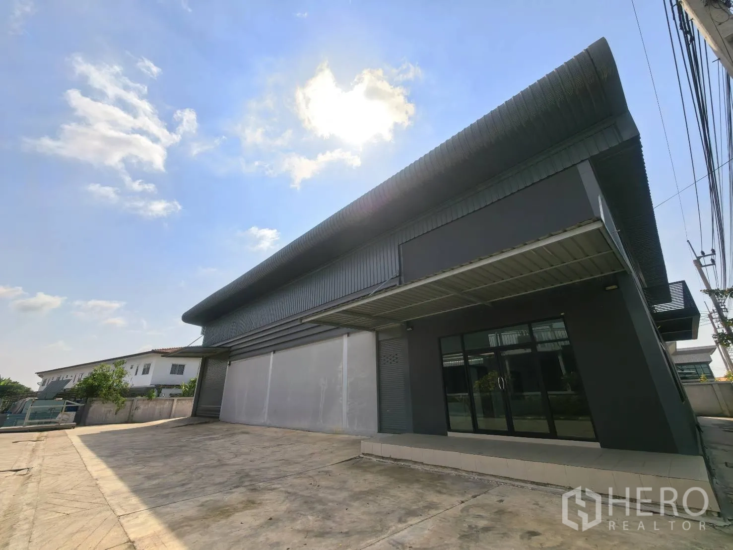在Samut Prakan省Bang Bo区布局您的生产基地。这座现代工厂提供约1,165㎡可用面积,土地为230平方哇(约920㎡,约0.58莱)。门面为两层现代办公楼,后接挑高生产车间。院内混凝土场地宽阔,设有雨棚装卸位与超大卷闸门,卡车出入装卸高效便捷。车间内铺设亮蓝色环氧地坪,配天窗与通风百叶,适用于洁净制造或仓储。办公室采光充足,并配茶水间与整洁卫浴,便于团队使用。