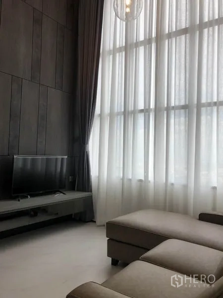 这套位于曼谷沙吞的公寓为1卧1卫,使用面积37平方米,采用Loft挑高设计,空间通透。双层挑高客厅配落地大窗,城市景观一览无余,球形吊灯与转角沙发营造时尚氛围。精致小厨房配备大冰箱、微波炉、电磁炉及室内洗衣机。现代卫浴设玻璃淋浴间与大镜面。阁楼卧室以玻璃栏杆俯瞰客厅,灯光温暖舒适。