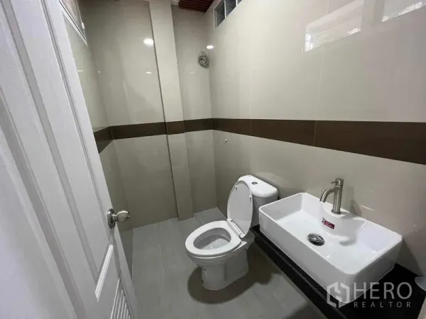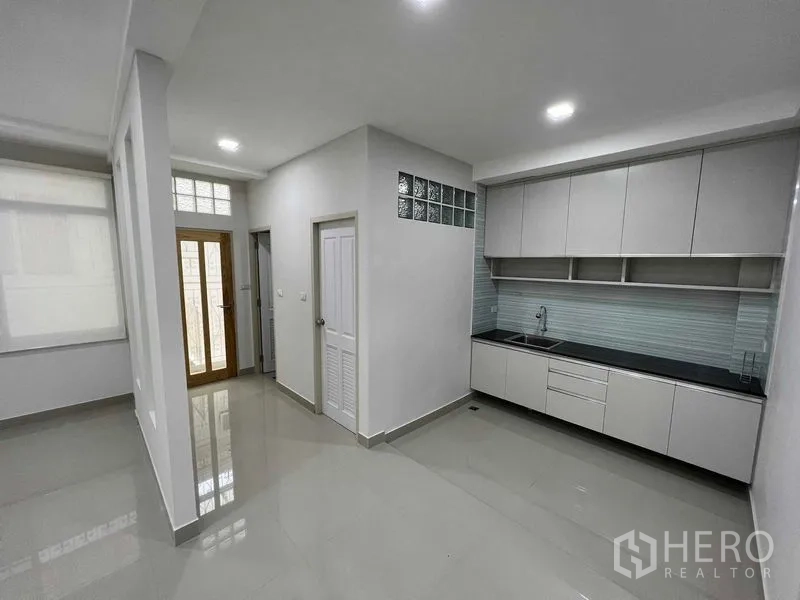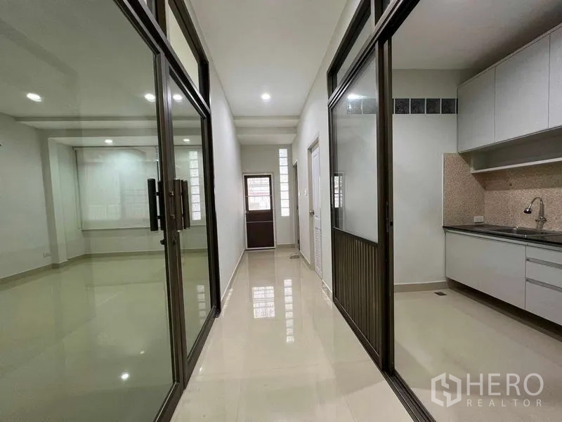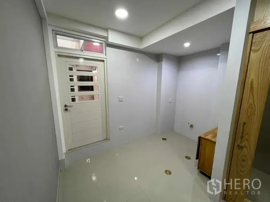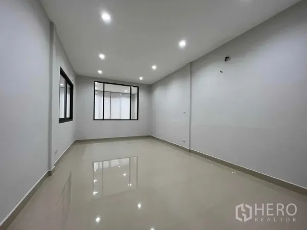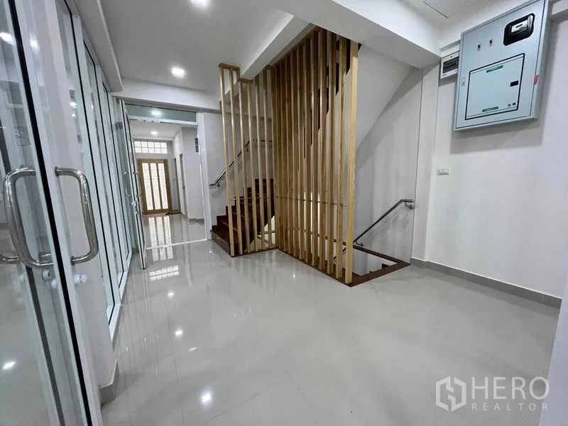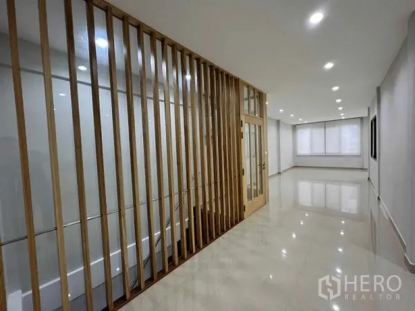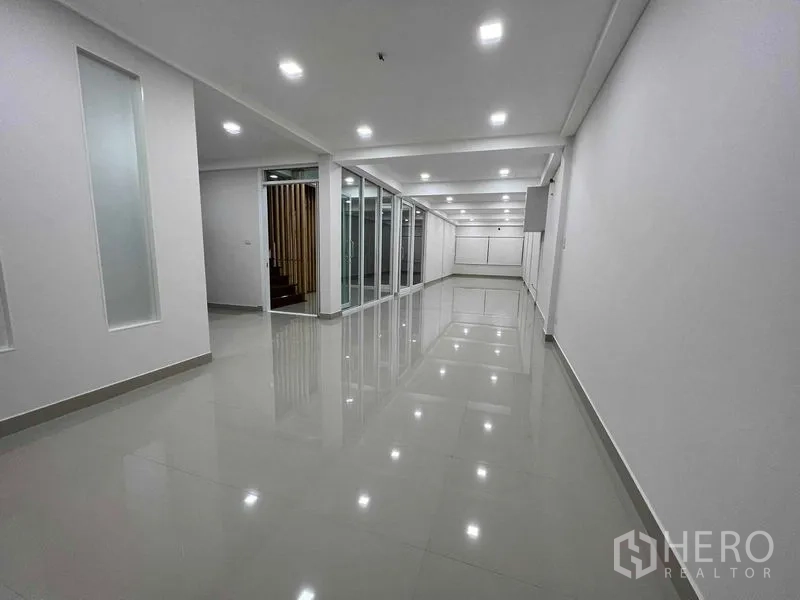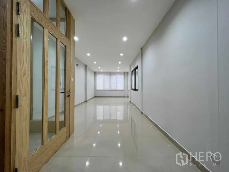 位于曼谷Huai Khwang区的240平米居办一体空间,步行即达MRT Sutthisan,适合成长型团队或居住办公一体化人士。照片展示了通透明亮的开放式楼层、玻璃隔断会议室与温润木地板。3间灵活卧室可改作私密办公室,4间现代卫浴满足日常需求,配备实用茶水间。多处阳台引入清风与城市景观,安全门禁与有顶停车位提升日常便捷。
