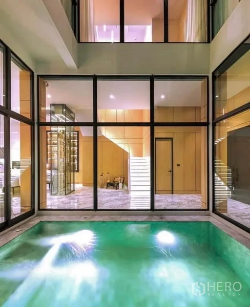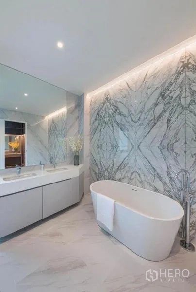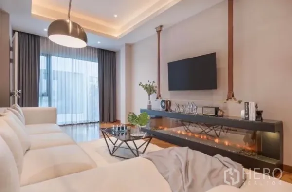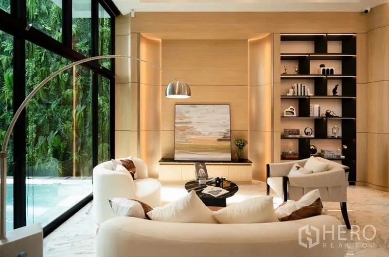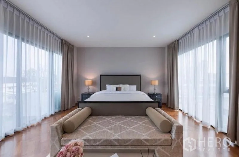 曼谷瓦他那区出售4卧5卫独栋别墅,使用面积约550平米。土地面积为55平方哇(约220平米,约0.14莱),为家庭生活提供舒适尺度。室内设有宽敞客餐厅、实用现代厨房,以及带独立卫浴的卧室,私密与便利兼具。