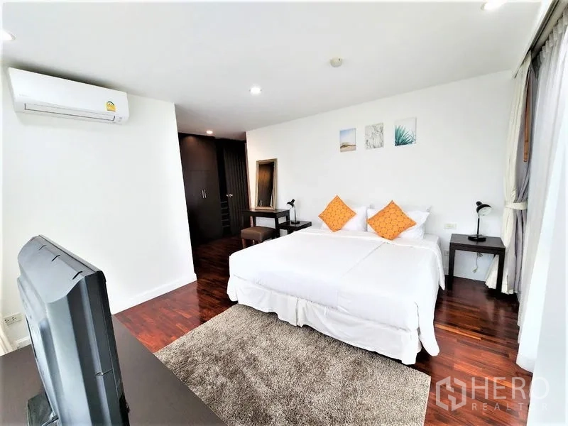 这套位于Silom片区的公寓建筑面积约200平米,3卧3卫,坐落于Bang Rak。明亮的客餐一体空间配整排窗与光泽木地板;独立厨房设施齐全,设大量柜体、嵌入式烤箱、大冰箱及窗边小餐桌。卧室均为大尺度,主卫配圆形浸泡浴缸与玻璃淋浴间。另设分体空调、电视柜及实用的女佣/储物间,整体以温和中性色调打造,拎包即住。
