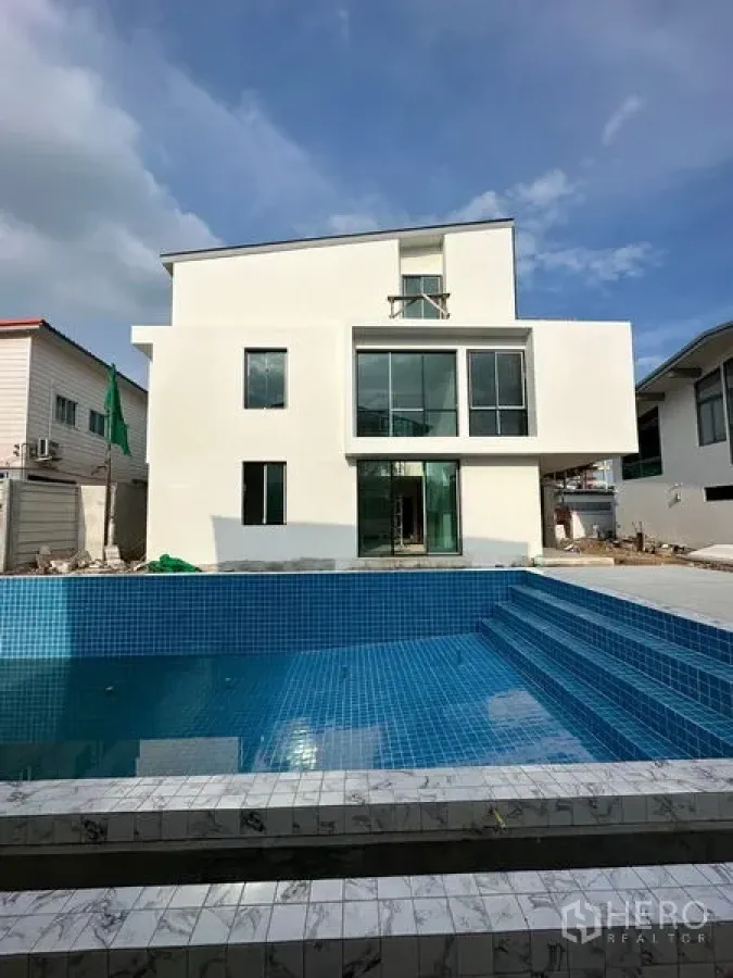 位于曼谷瓦他那区的现代独栋别墅,使用面积约380㎡,规划3卧室4浴室。室内以温润木地板与整面落地窗营造通透明亮的氛围,挑高客厅气场十足,多个阳台与大露台可欣赏社区景观。户外配备私人泳池区域(待完善),无论家庭起居或社交宴请都十分适合。