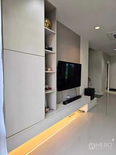 这座位于Khan Na Yao的现代两层独栋别墅,使用面积约164㎡,布局为3卧3卫。土地面积41平方哇(约164㎡,约0.10莱),设有带门私家车位与阳台,客厅明亮开阔,亮面地砖与筒灯营造当代质感;定制电视墙与置物柜收纳充裕。推拉玻璃门连接到带顶木质露台和吊扇,园区精心打造的禅意花园以砾石、踏步石与氛围灯组成,静谧且私密。二层过道带储物柜,卧室均带衣柜,实用舒适。