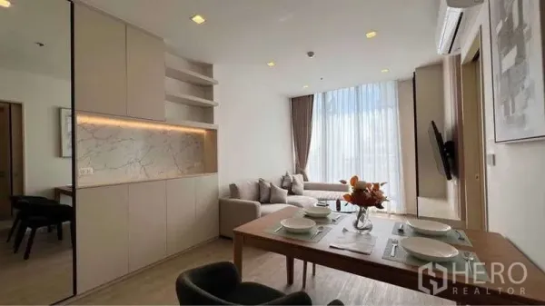 这套30平方米的一居一卫公寓位于瓦他那区核心地段,步行可达BTS Asok与MRT Sukhumvit。开放式布局,客厅设有大理石电视背景墙,镜面餐区配吊灯,旁边是一字型亮面橱柜厨房。浅色沙发靠近落地窗,自然光充足,可欣赏曼谷天际线景观。卧室配软包床头、大理石装饰板与暖色吊灯,营造精品酒店般的质感。