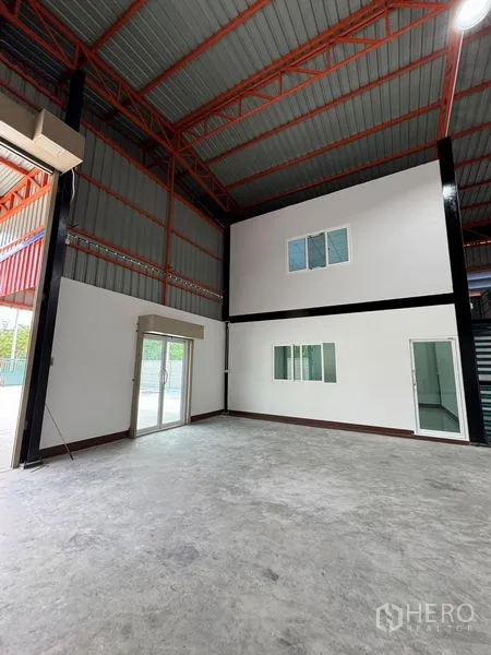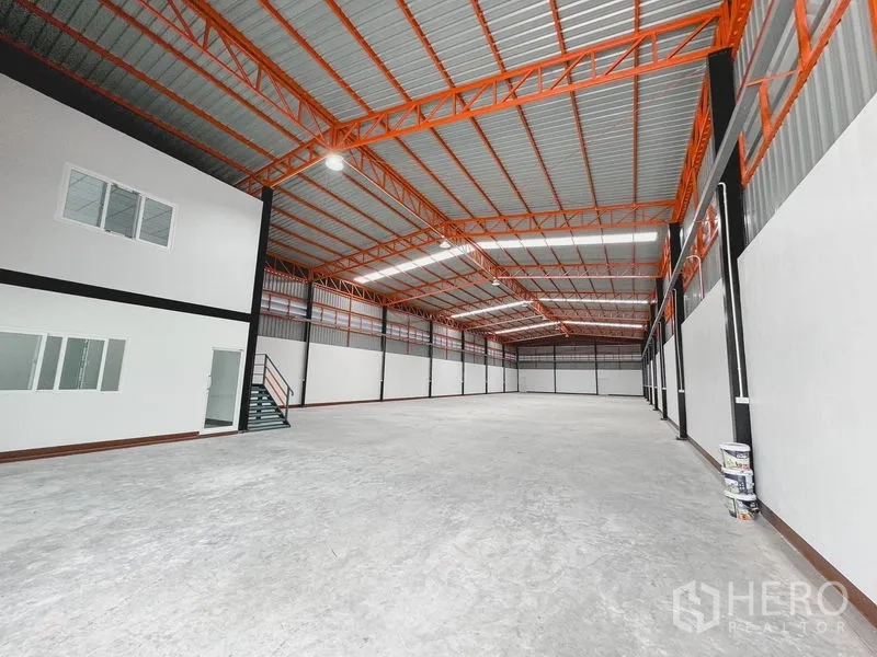 位于Khlong Luang(巴吞他尼)的现代高挑仓库出租,使用面积750㎡,土地400平方哇(约1,600㎡/1莱)。设有超大混凝土堆场,适合货车调头;高卷闸装卸口;围墙与大门安全到位;庭院照明与临水围栏。室内配两层办公区,玻璃门与明亮地砖房间,并设独立卫生间。