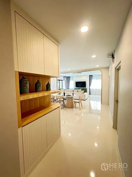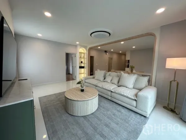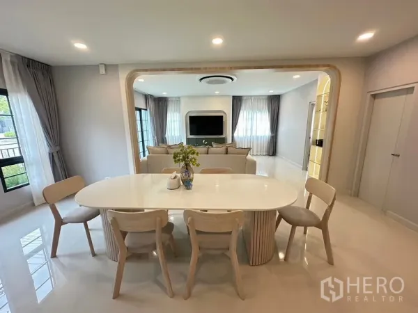 位于Samut Prakan省Bang Phli区Bang Kaeo的4卧5卫独栋别墅,使用面积约303平方米,土地66平方哇(约264平方米,约0.165莱)。格局适合家庭生活,采光良好的客餐厅一体空间,功能齐全的厨房与充足收纳,主卧配套内卫生间,其余卧室与卫浴满足多代同堂需求。带小花园与有顶停车位,日常居住更舒适。