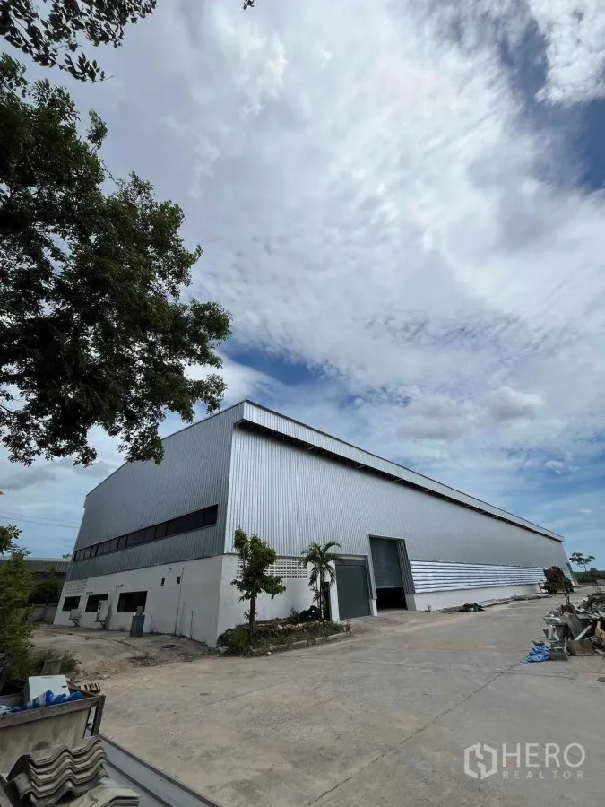本案为罗勇府尼空帕他那出售工厂,金属夹板建筑,提供约 7,000 平方米灵活生产与仓储空间。土地面积 6,800 平方哇(约 27,200 平方米,约 17 莱),配超大混凝土院场,便于集装箱进出与回转。仓库层高通透,钢桁架屋顶,超大滑门与通风砖墙,重载地坪可靠。园区内设独立单层办公楼,含开放式办公区、独立办公室与采光良好的会议室。