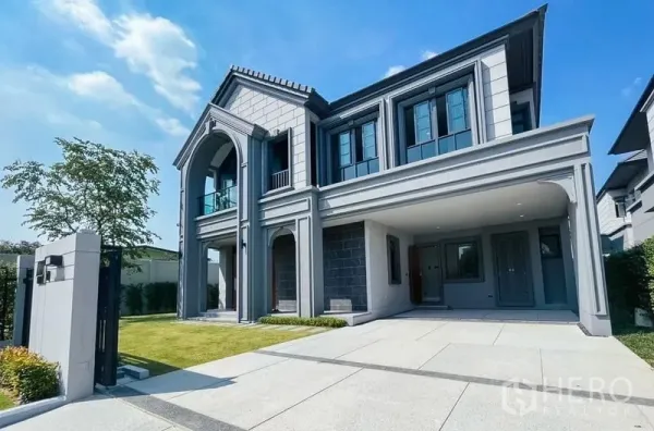 位于暖武里府直辖县的安全社区,这座3卧3卫独栋住宅提供180平米使用面积,土地57平方哇(约228平米,约0.14莱)。前院设有带顶双车位,绿化整洁。室内为通透客餐一体,大窗与特色天花相连,旁边是备餐台以及独立泰式厨房,配燃气灶与充足收纳。二层为实木地板,主卧带阳台,次卧采光充足并带柜体。