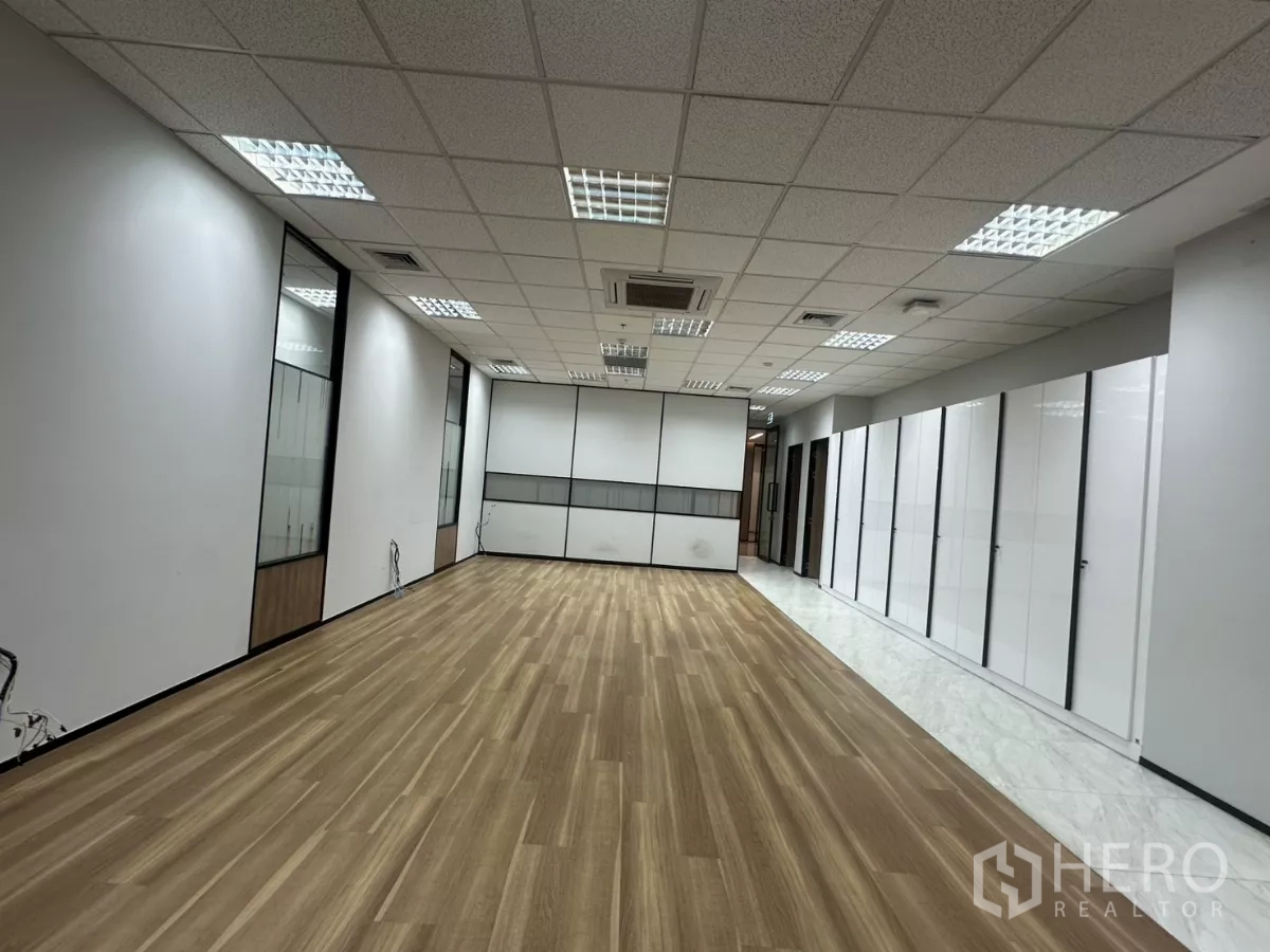 位于曼谷素坤逸CBD的Watthana区,412㎡高端办公室出租,步行可达BTS Asok与MRT Sukhumvit。精致装修包含大理石地面接待区、玻璃隔间会议室、带大理石装饰柜的行政套间、铺地毯的私密办公室以及现代茶水间。开放式工作区采用木纹地板,配充足的内置储物、卷帘与开阔城市景观。共设11个灵活房间,满足董事会议、团队协作与高管专注空间等多种需求。