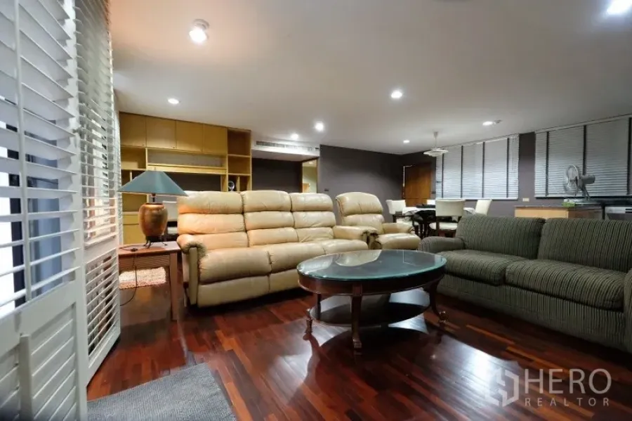 位于曼谷瓦他那区(Khlong Tan Nuea)的三卧两卫公寓,使用面积约142㎡。客餐厅连通阳台,采光通透;实用型现代厨房与充足收纳满足日常所需;卧室分区合理,私密舒适,全屋选材考究,细节品质到位。