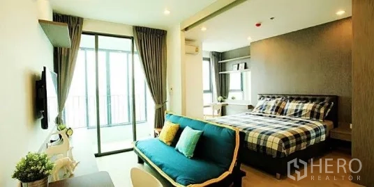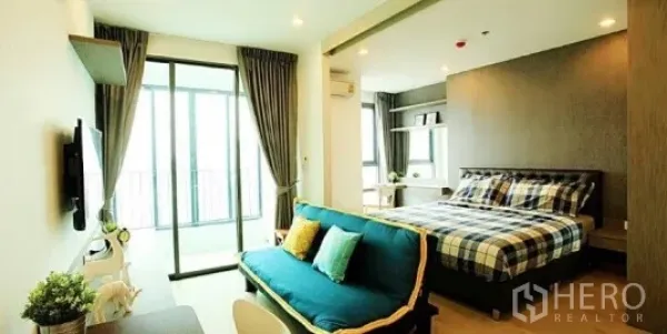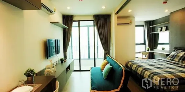 这套新上线的一居一卫公寓位于曼谷邦拉克区,实用面积34㎡,布局紧凑高效。客厅明亮通风,连接观景阳台;卧室配内置收纳与落地窗;小厨房时尚实用;浴室采用玻璃干湿分离设计。大楼为现代高层立面,出入安保完善,并配备健身房、泳池、停车位与24小时安保等实用设施。