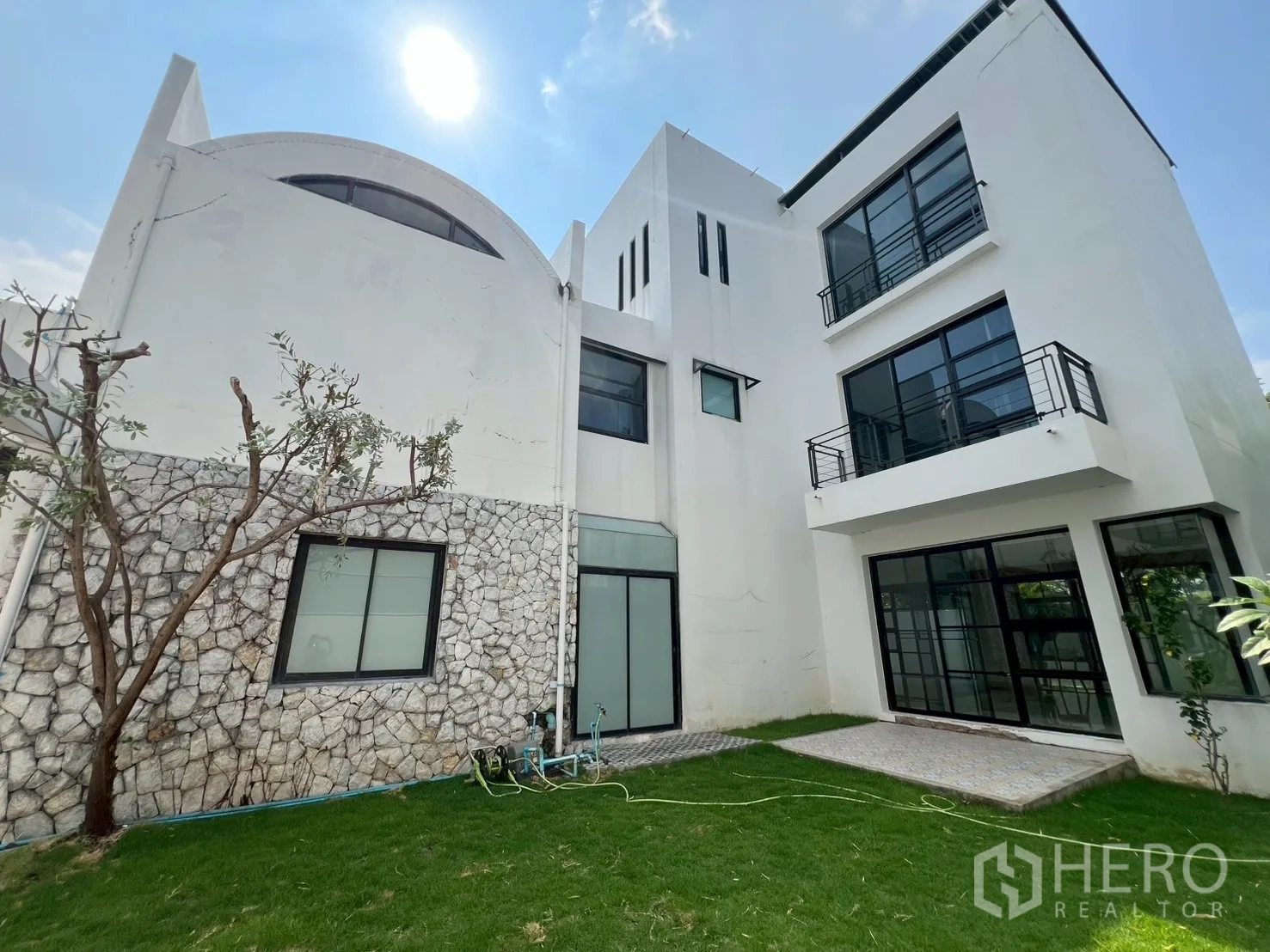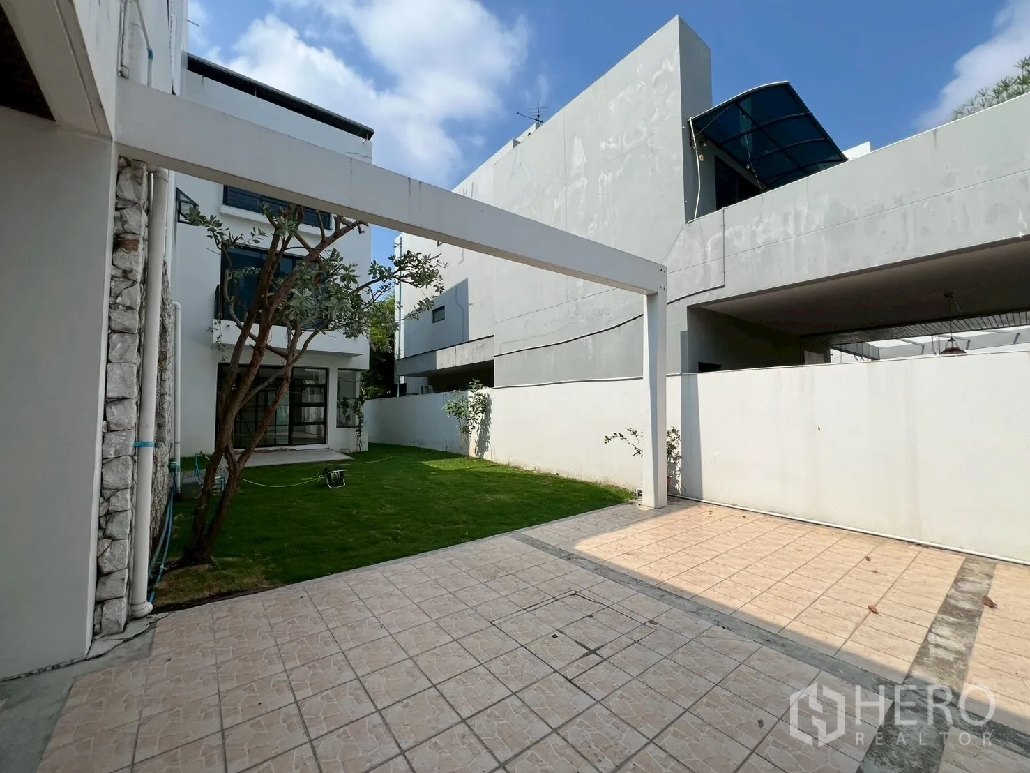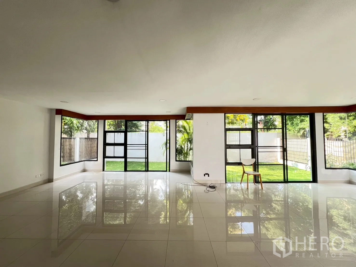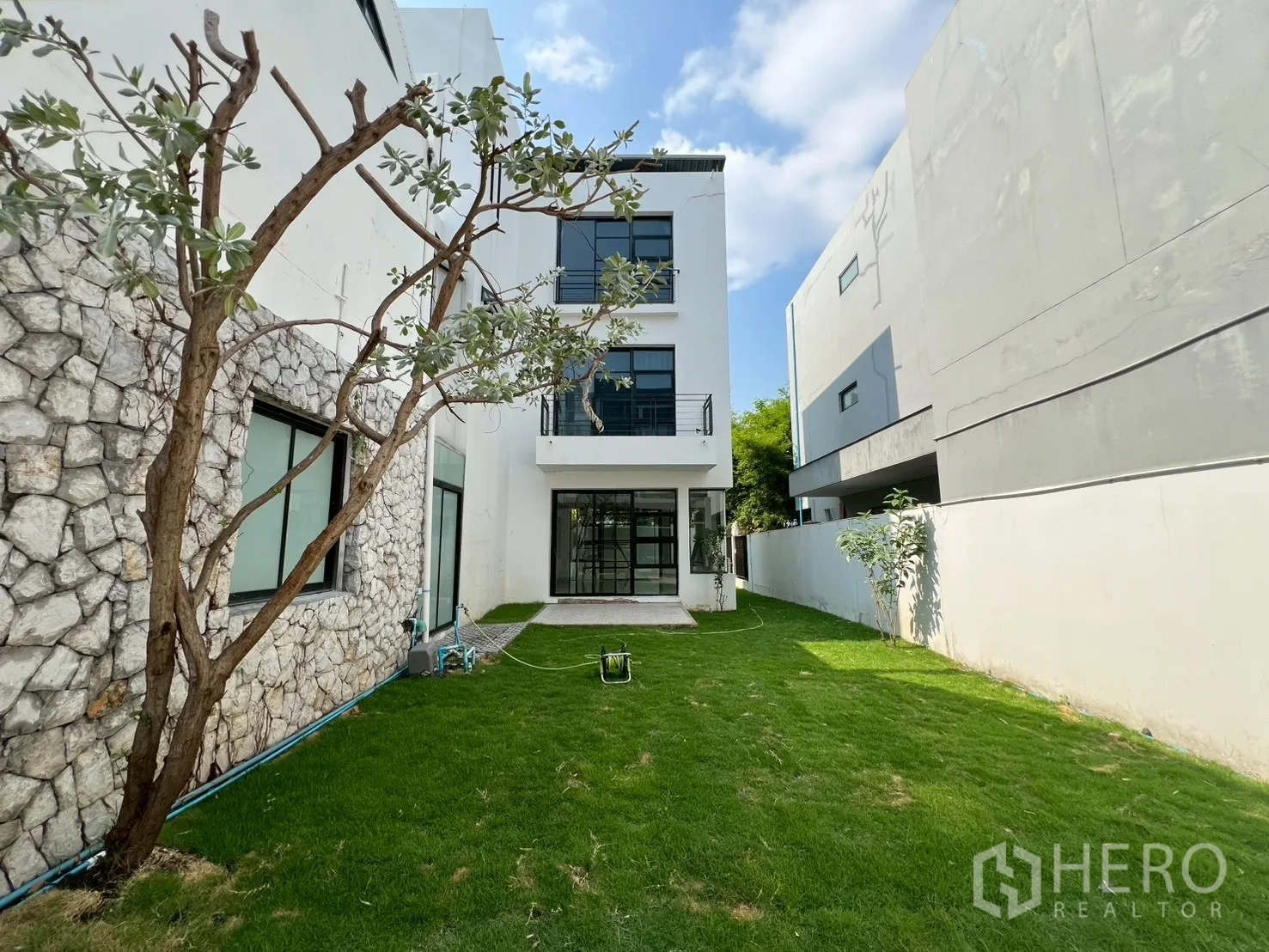 这栋独栋住宅出租,位于泰国曼谷府Watthana(วัฒนา区),拥有约600平方米使用面积,土地101平方哇(约404平方米,约0.25莱)。首层设有超大客餐厅,亮面地砖与落地窗引入充足采光,并可欣赏绿意景观。独立厨房配备大量浅木柜体、花岗岩台面、燃气灶与双水槽。楼层动线通往上层的大型屋顶露台,适合户外休闲与盆栽园艺。