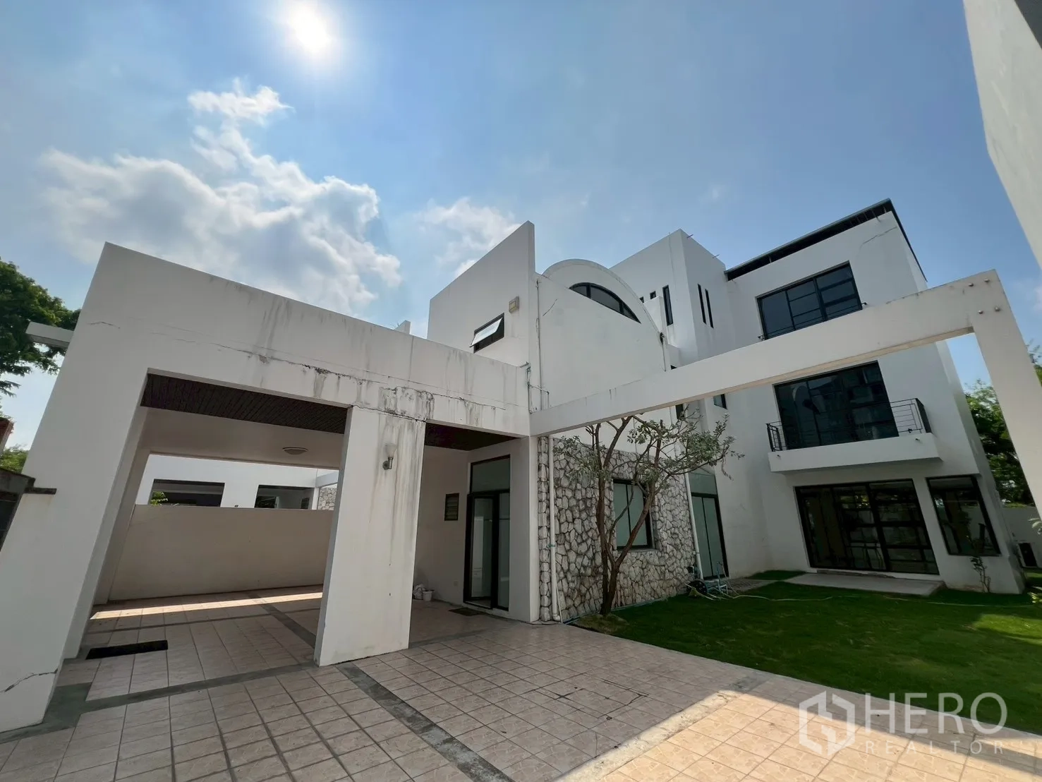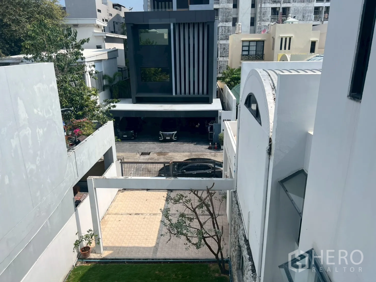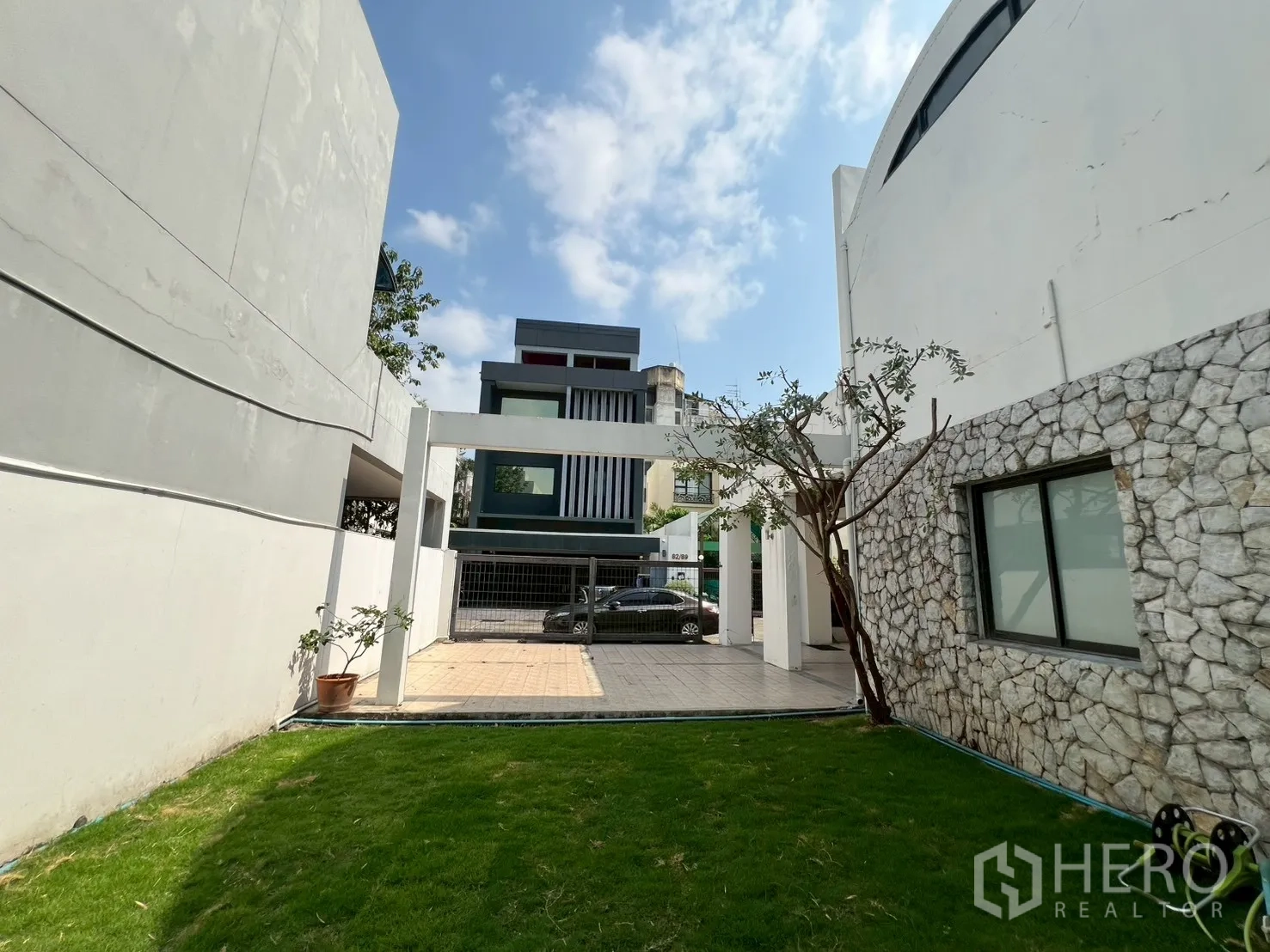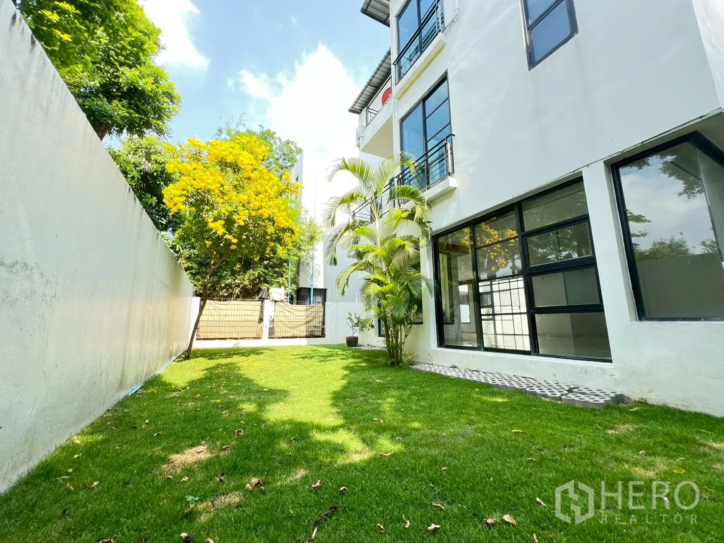 这栋独栋住宅出租,位于泰国曼谷府Watthana(วัฒนา区),拥有约600平方米使用面积,土地101平方哇(约404平方米,约0.25莱)。首层设有超大客餐厅,亮面地砖与落地窗引入充足采光,并可欣赏绿意景观。独立厨房配备大量浅木柜体、花岗岩台面、燃气灶与双水槽。楼层动线通往上层的大型屋顶露台,适合户外休闲与盆栽园艺。