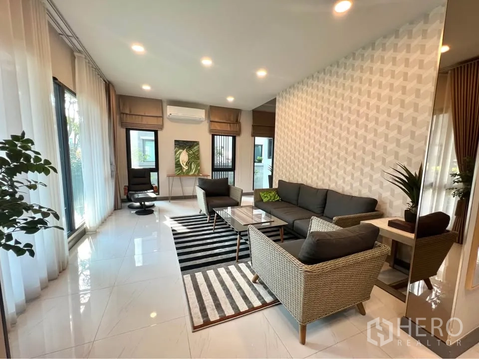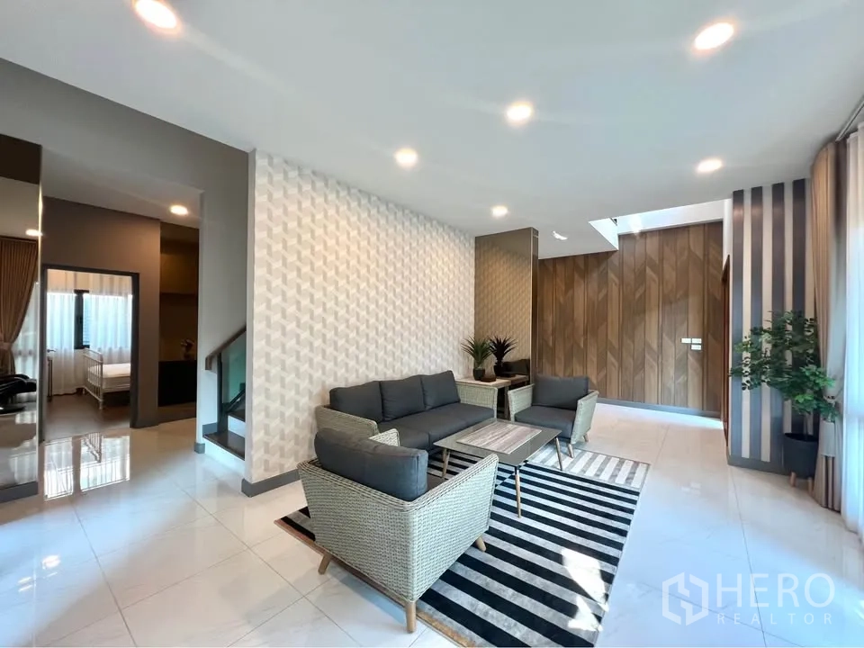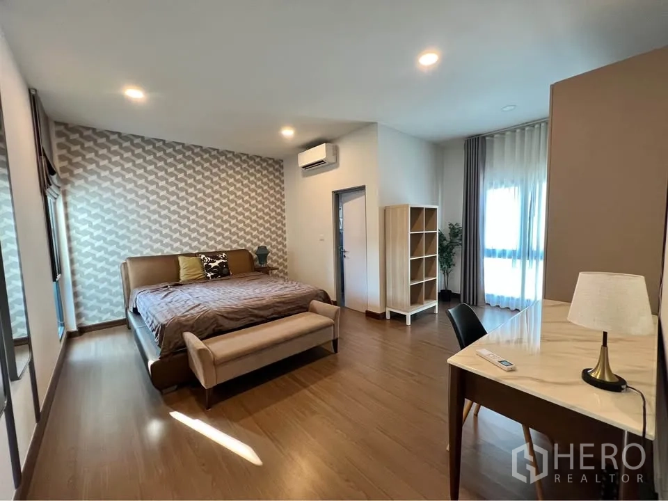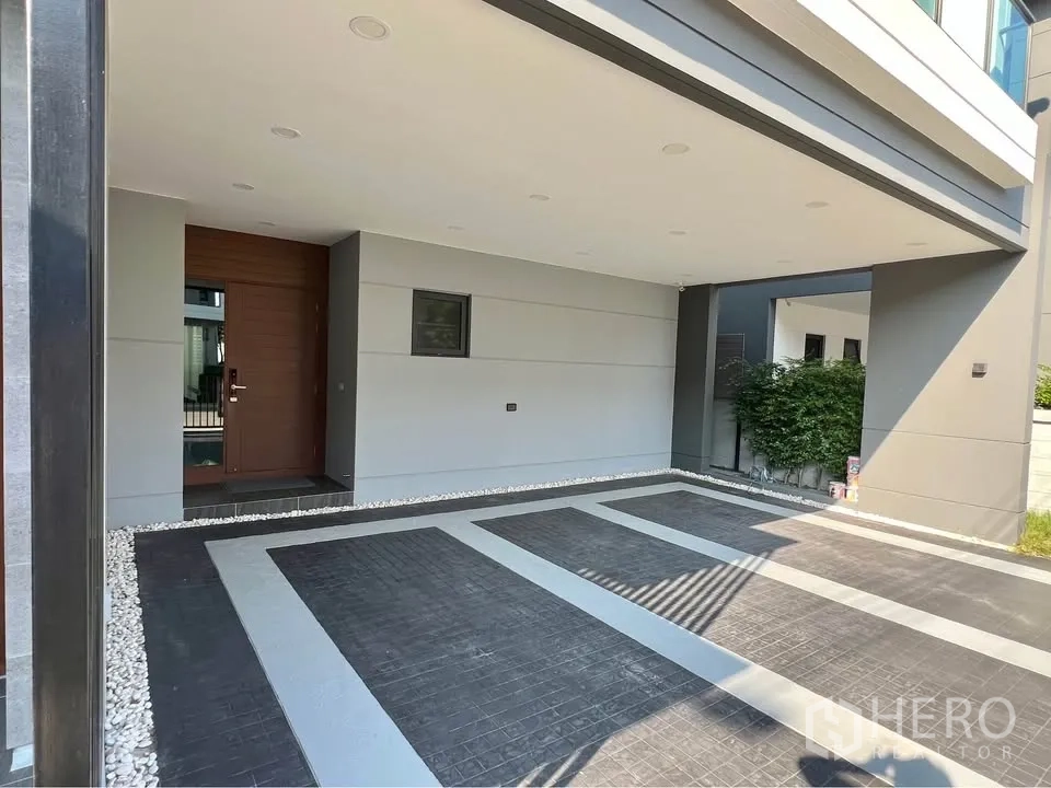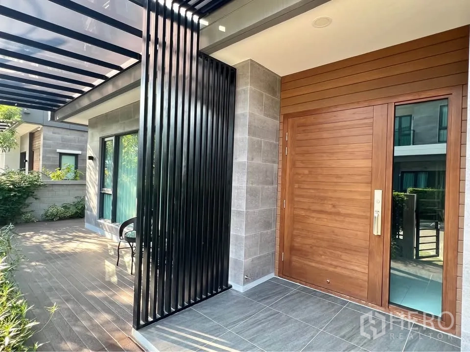 二层为温润木地板,多间卧室设衣柜与书写台;主卧连接阳台并设舒适休闲椅。挑高楼梯间悬挂艺术水晶灯,格调十足。室外有带顶的木质露台,临近整齐绿篱;立面现代,并设有阳台与有顶车棚。地处Bang Phli,出行便捷,可轻松前往 Bang Na–Trat 路、Mega Bangna、IKEA Bangna 以及素万那普机场。房源现正对外出租,欢迎联系预约看房。