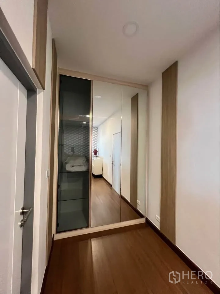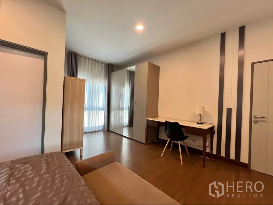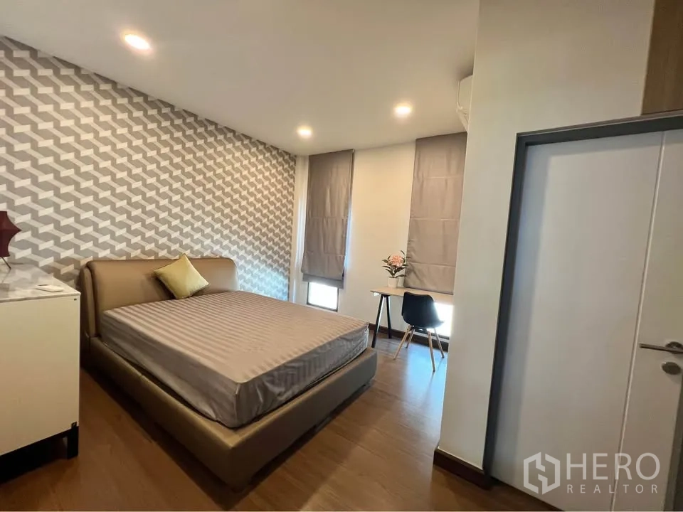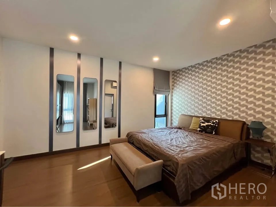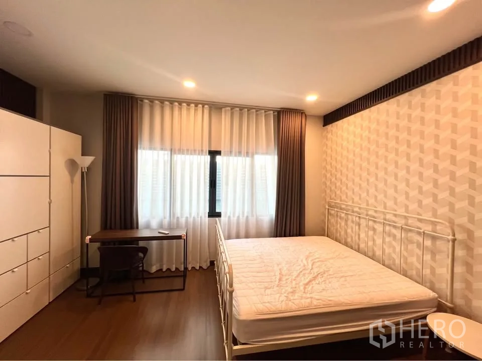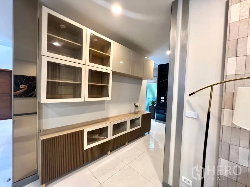二层为温润木地板,多间卧室设衣柜与书写台;主卧连接阳台并设舒适休闲椅。挑高楼梯间悬挂艺术水晶灯,格调十足。室外有带顶的木质露台,临近整齐绿篱;立面现代,并设有阳台与有顶车棚。地处Bang Phli,出行便捷,可轻松前往 Bang Na–Trat 路、Mega Bangna、IKEA Bangna 以及素万那普机场。房源现正对外出租,欢迎联系预约看房。