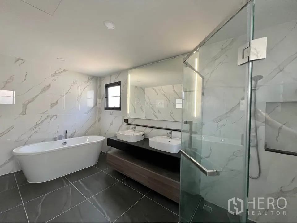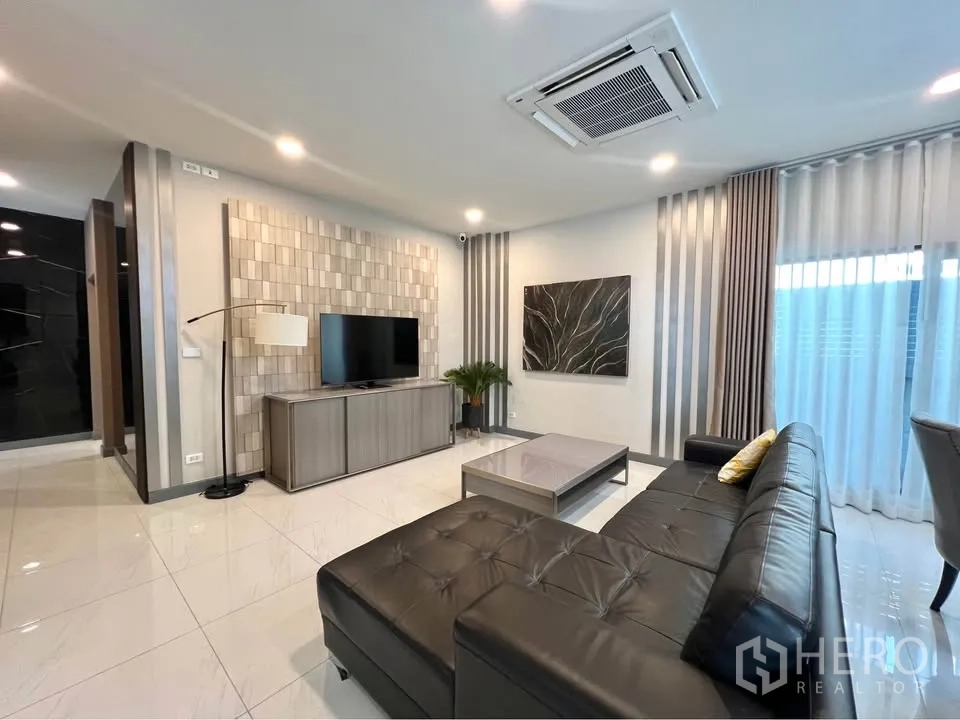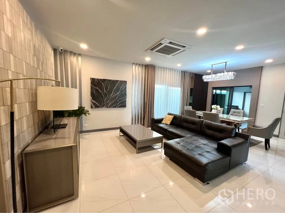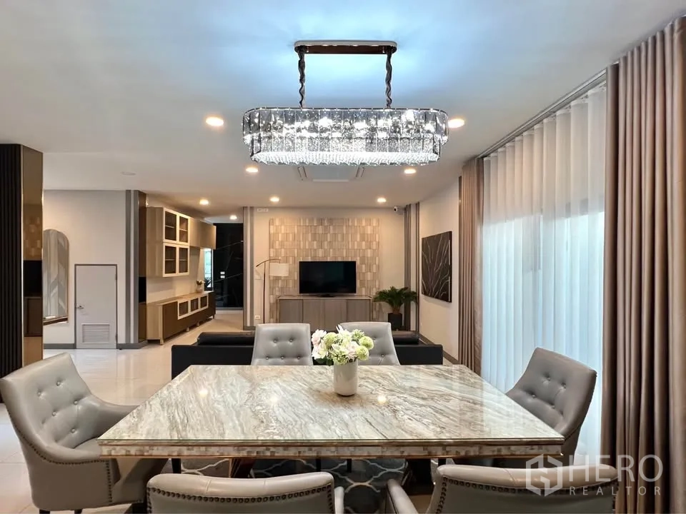 这栋位于 Bang Phli(Samut Prakan)的独栋别墅出租,提供宽阔居住尺度:使用面积约351平方米,土地75平方哇(约300平方米,约0.19莱)。户型为4卧5卫,适合家庭居住。一层为通透的客餐厅空间,水晶吊灯与大理石餐桌增添质感;两处起居区采光充足,落地玻璃与镜面装饰让空间更明亮,并配备空调保持舒适。